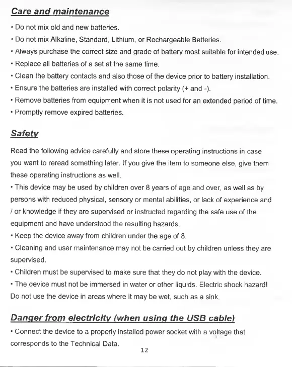 • Always purchase the correct size and grade of battery most suitable for intended use.