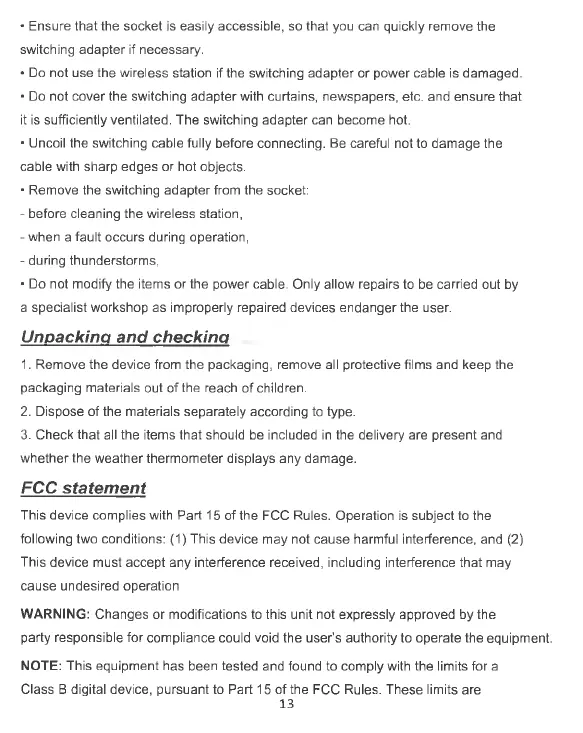 • Do not use the wireless station if the switching adapter or power cable is damaged.