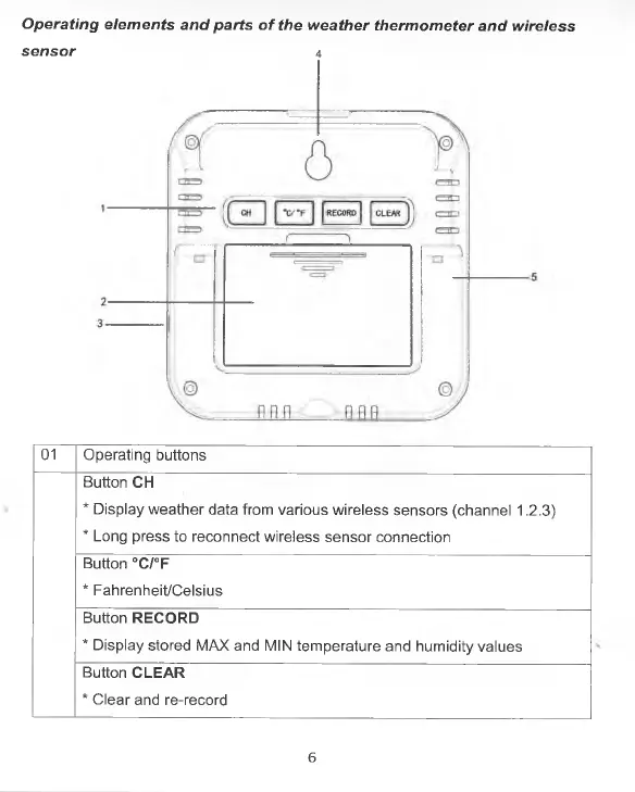 O p erating elem ents a n d parts o f the w eather th erm om eter a n d w ireless