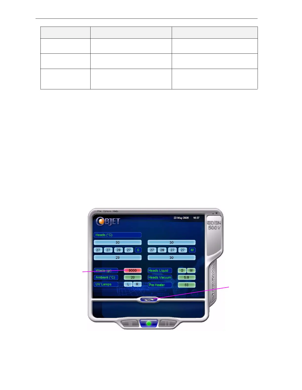 Figure 7-3: Eden printer interface, showing waste weight (red background indicates