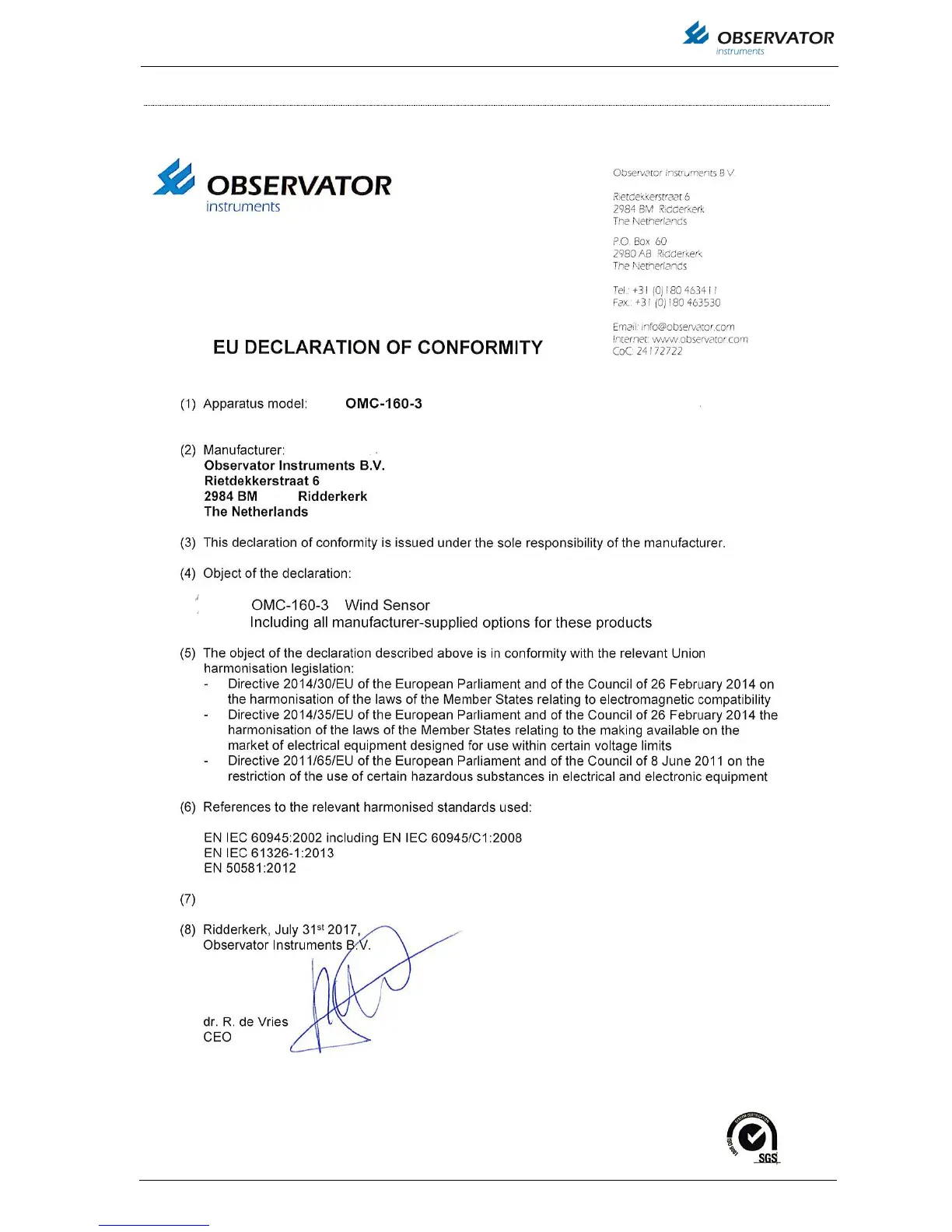 Observator OMC-160-3 - EU Declaration of Conformity