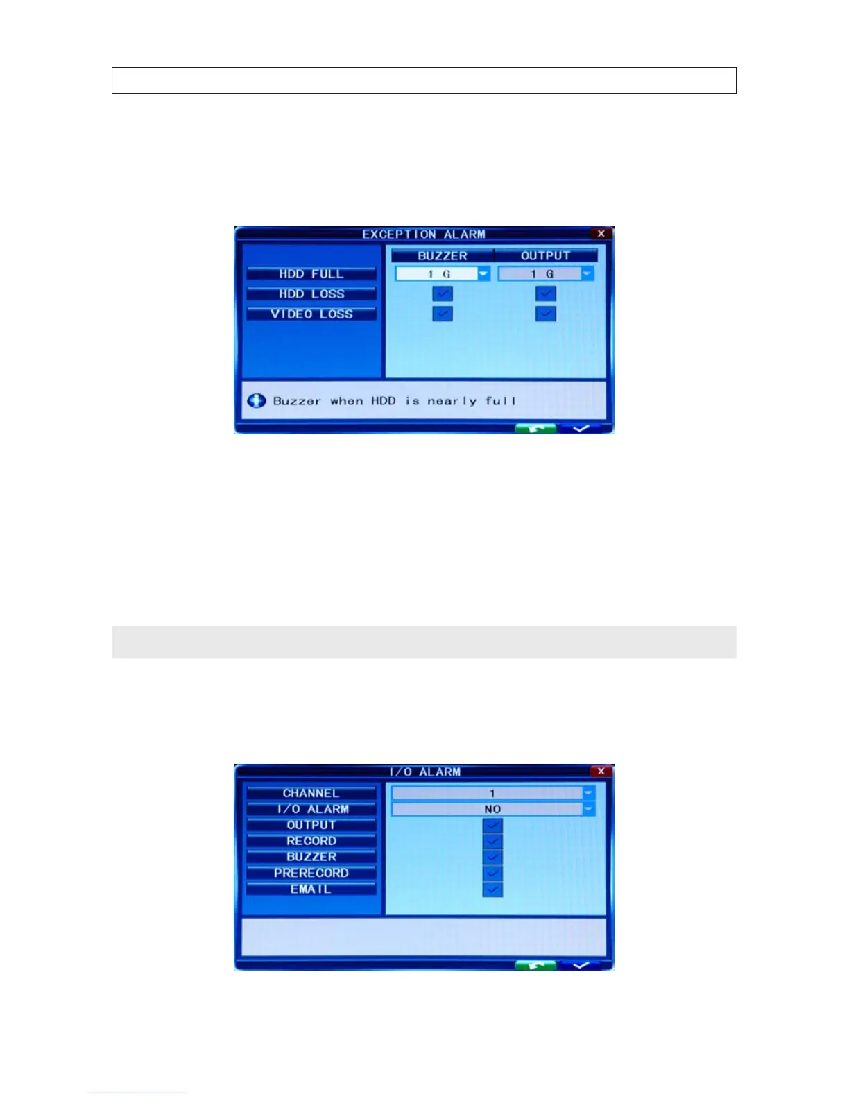 HDD FULL: You can set buzzer alarm and I/O output alarm when there is a dened space remaining for HDD to recording. Options