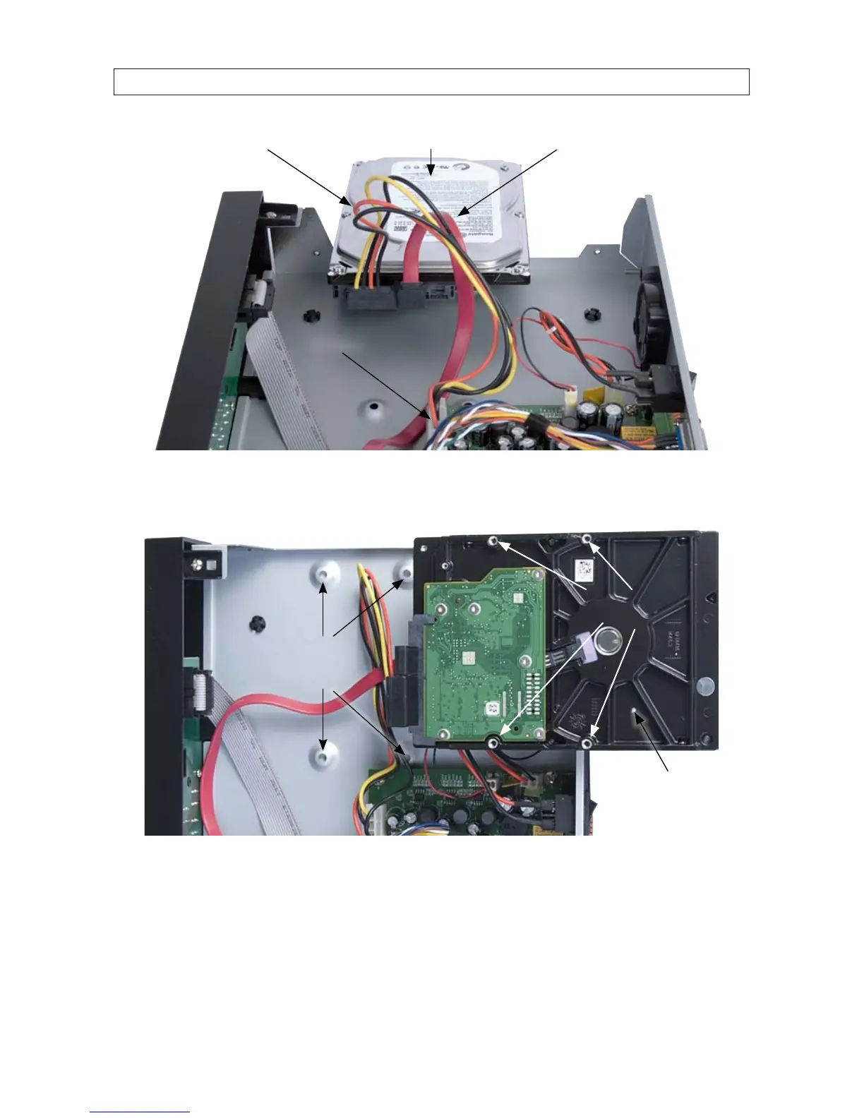 6. Position the HDD as shown in the photo below, aligning the chassis HDD mounting screw holes with the chassis HDD mounting
