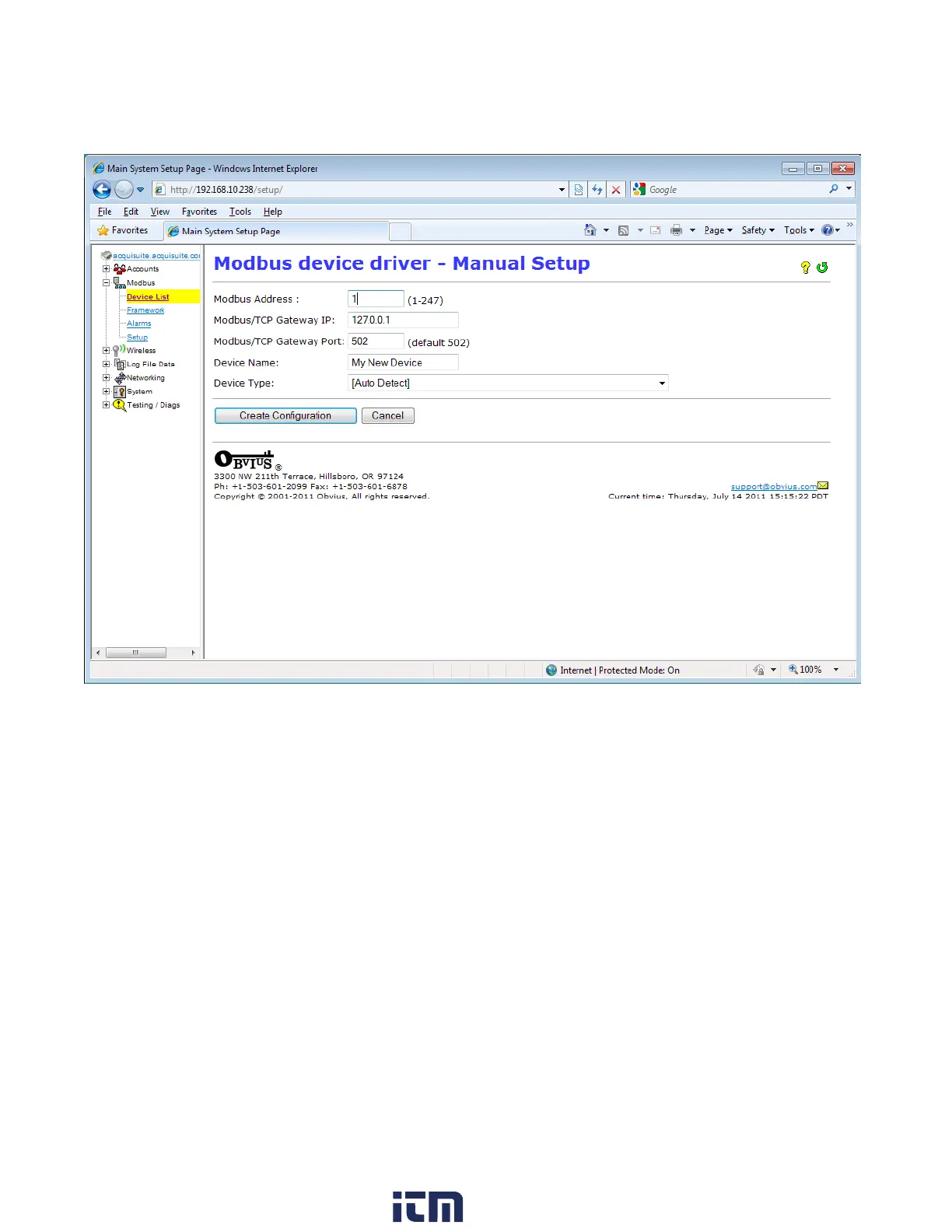 The manual setup page has several options that must be configured before the AcquiLite will recognize the Modbus device.