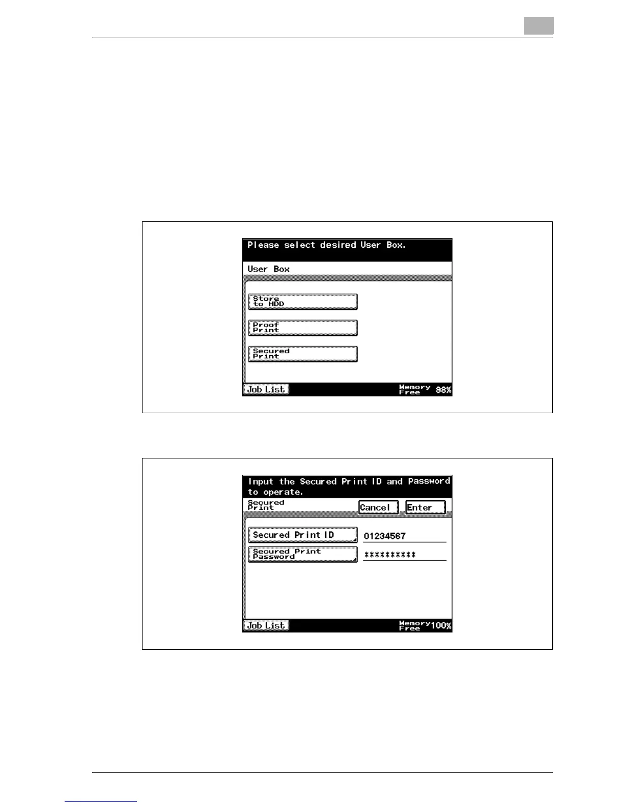 3 Enter the ID and password in Secured Print, and then touch [Enter].