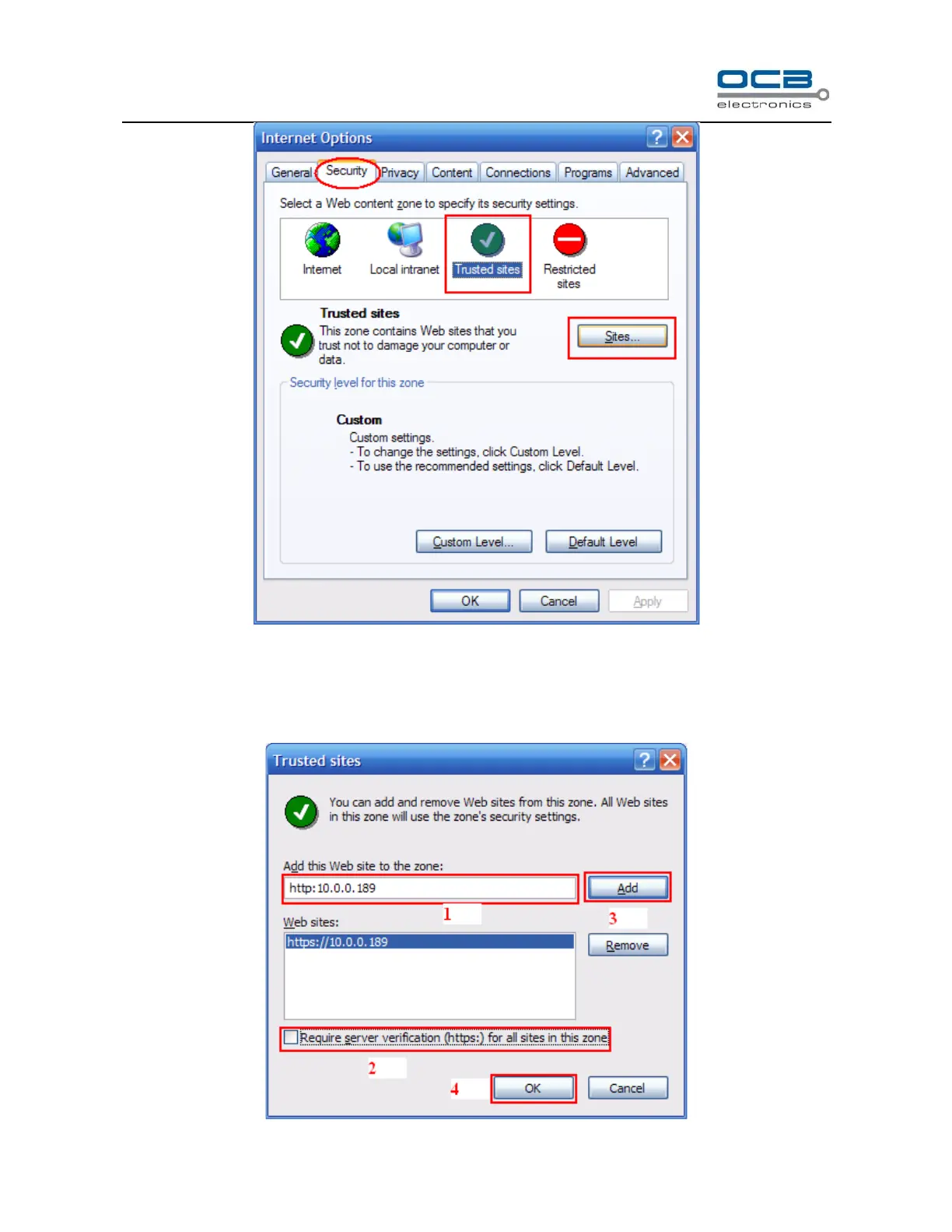 3. Input IP address of DVR to Add this Web site to the zone text box and click off in the front of Require
