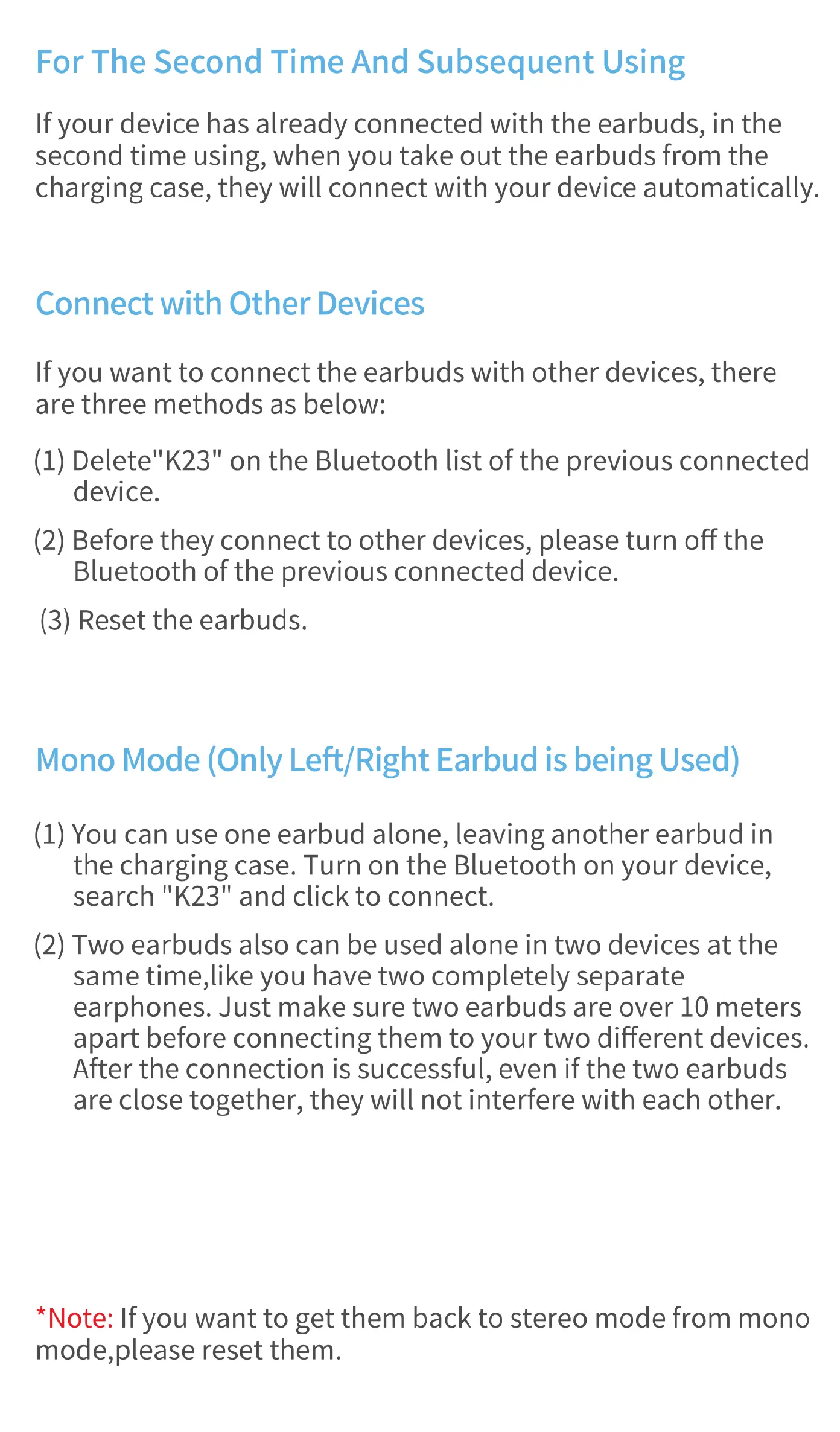 occiam K23 - For The Second Time And Subsequent Using; Connect with Other Devices; Mono Mode (Only Left;Right Earbud is being Used)