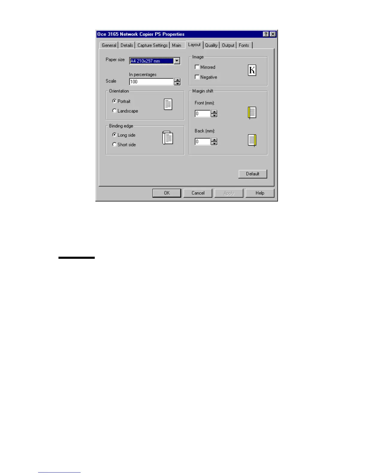 [45] The ‘Layout’ tab of the setup window of the Océ 3165 Network Copier printer driver