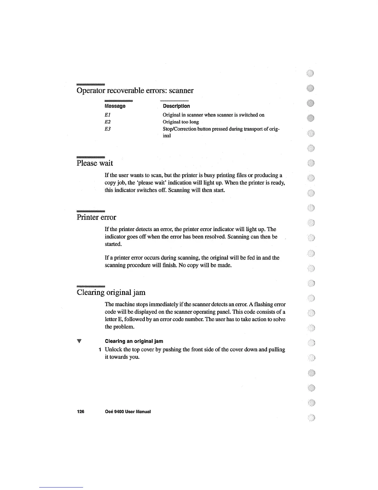 Oce 9400 - Operator Recoverable Errors: Scanner; Please Wait; Printer Error; Clearing Original Jam