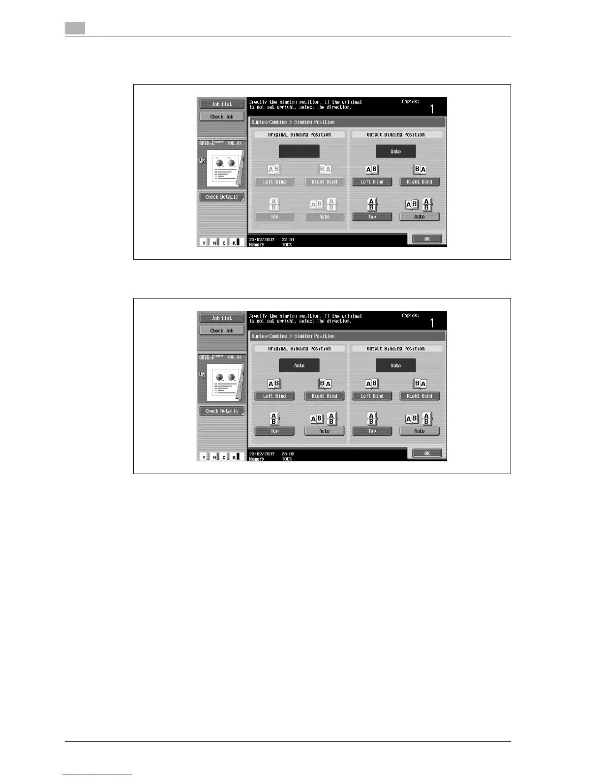 – For a single-sided original, select the binding position for the copy, and then touch [OK].