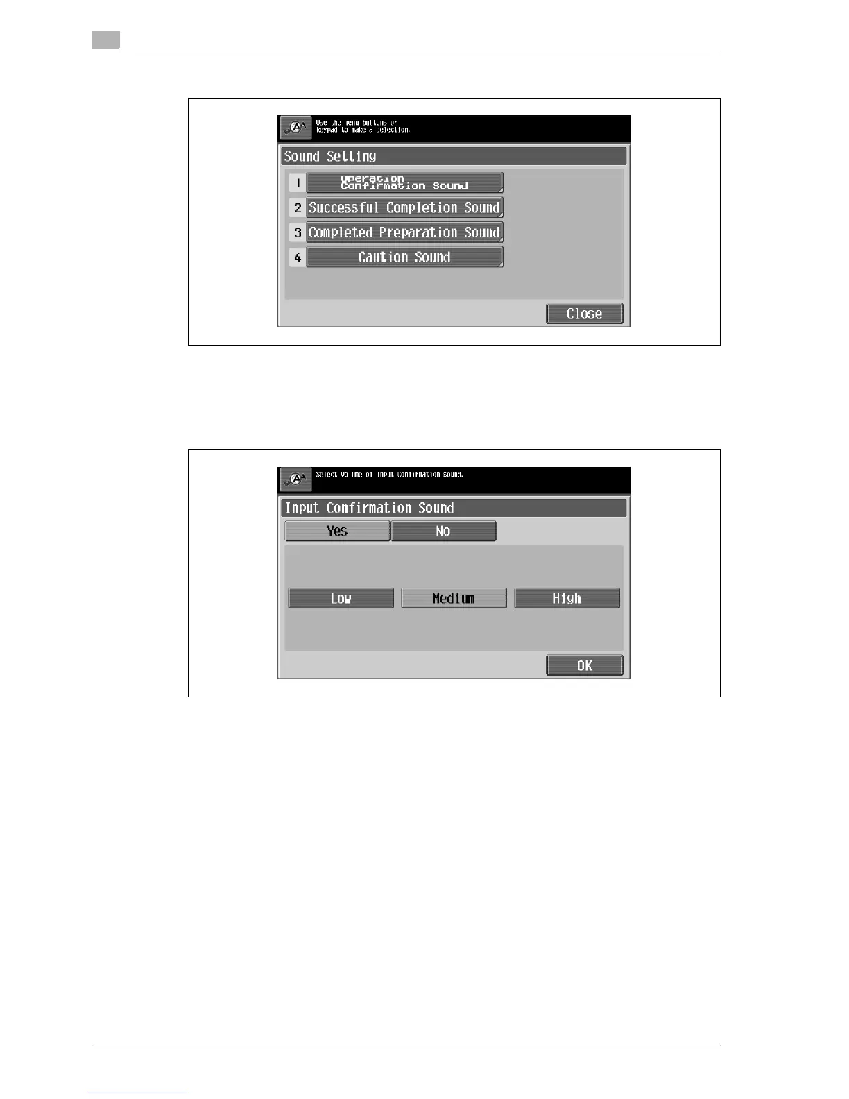 – To produce a sound, touch [Yes], and then touch [Low], [Medium] or [High]. To not produce a sound,