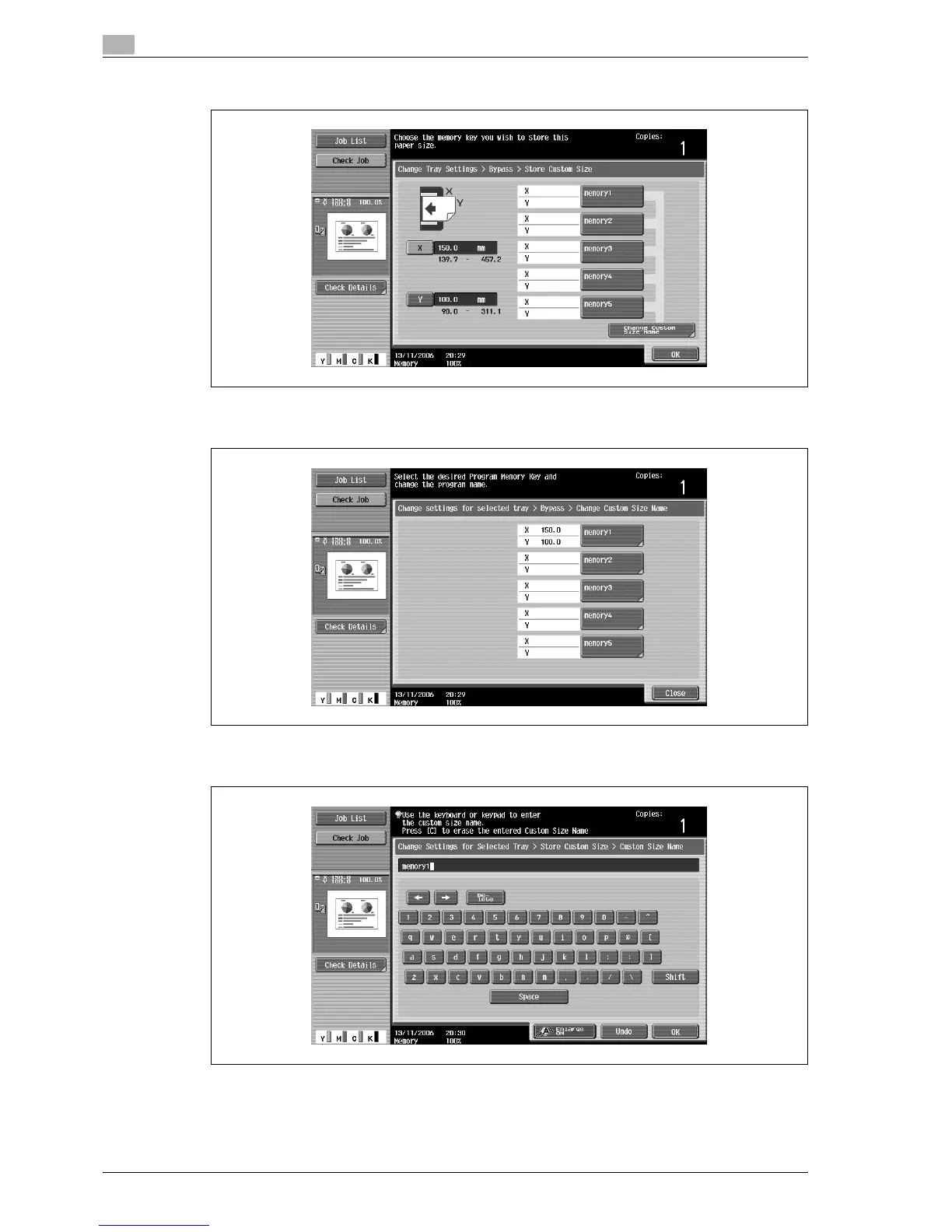 – To change the name of a memory key, touch [Change Custom Size Name], and then touch the key