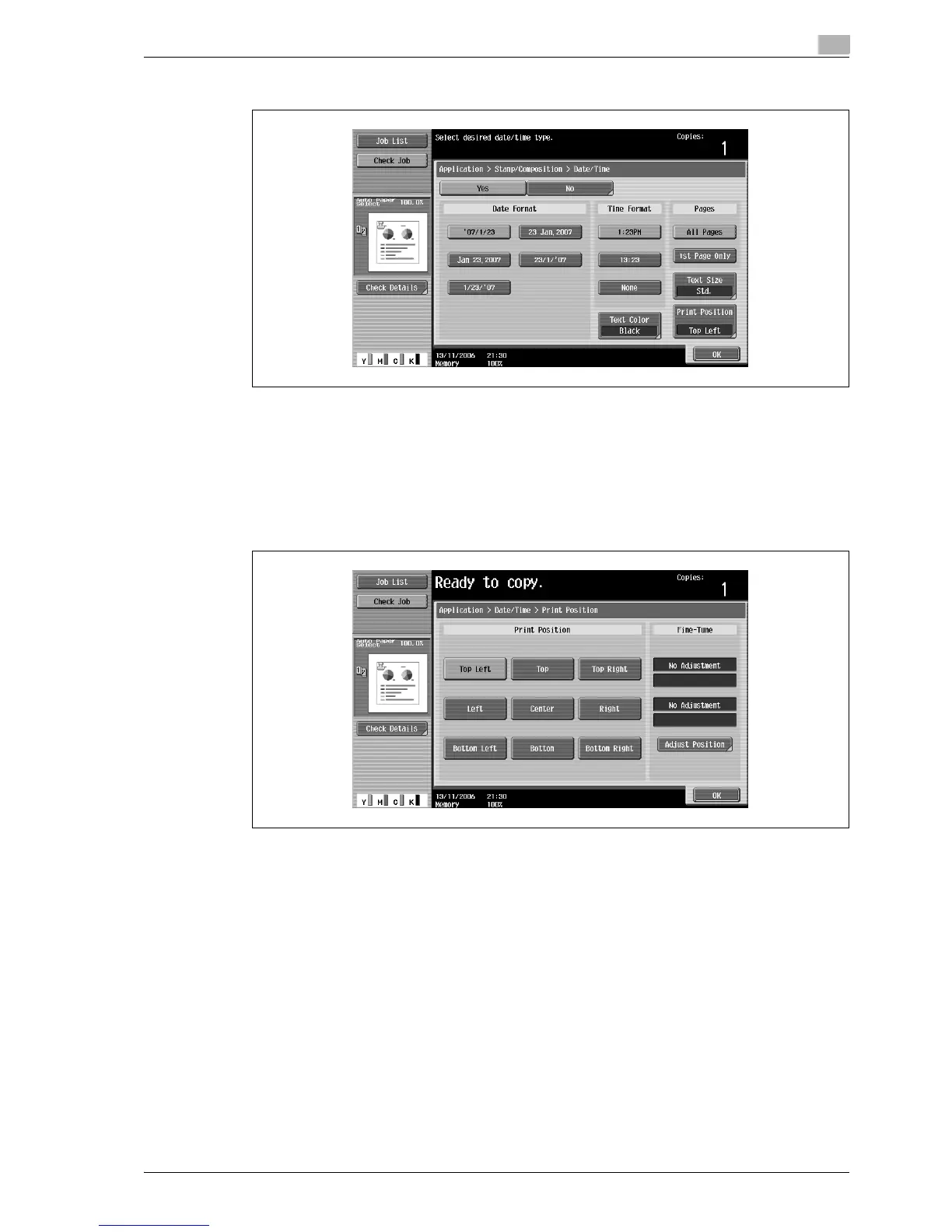 – To print the date/time only on the first page, touch [1st Page Only].