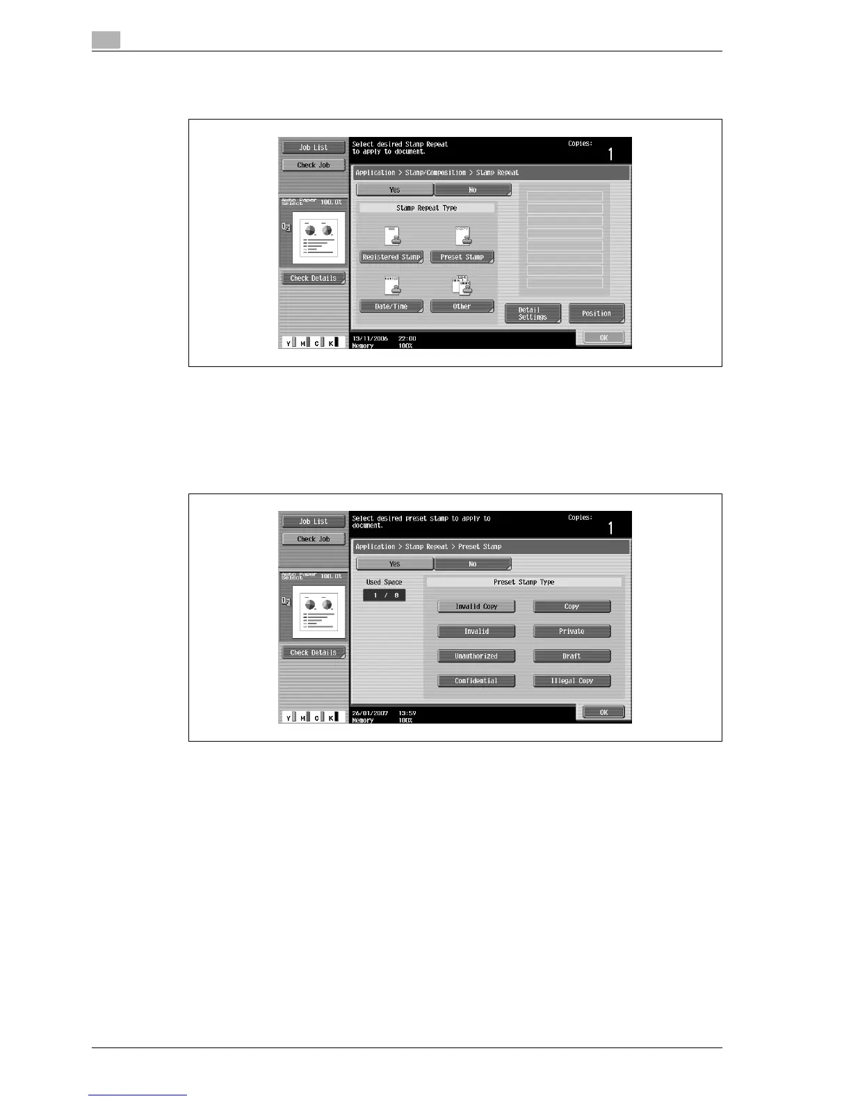 – Touch [Registered Stamp] or [Preset Stamp] to display a screen containing buttons for the available