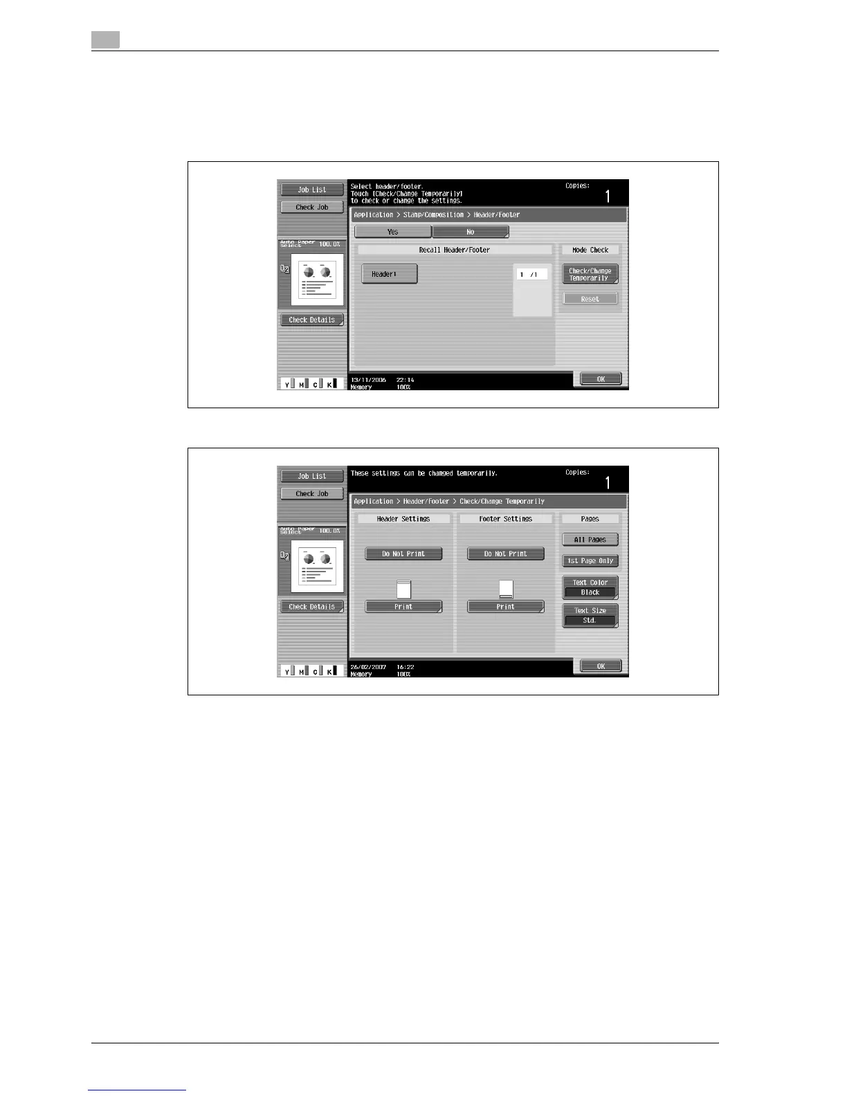 – To check or temporarily change the header/footer settings, touch [Check/Change Temporarily].