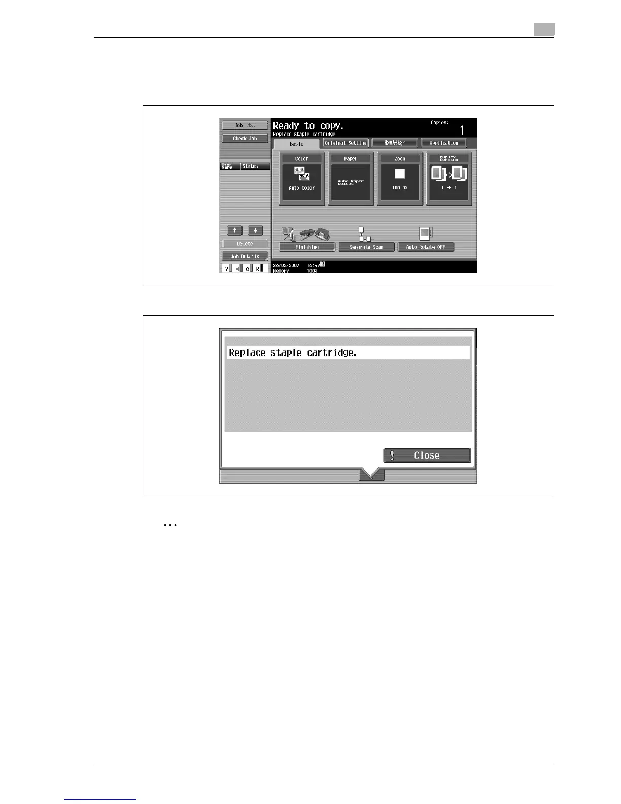 Be sure to replace the staple cartridge only after the message appears, otherwise the machine may be