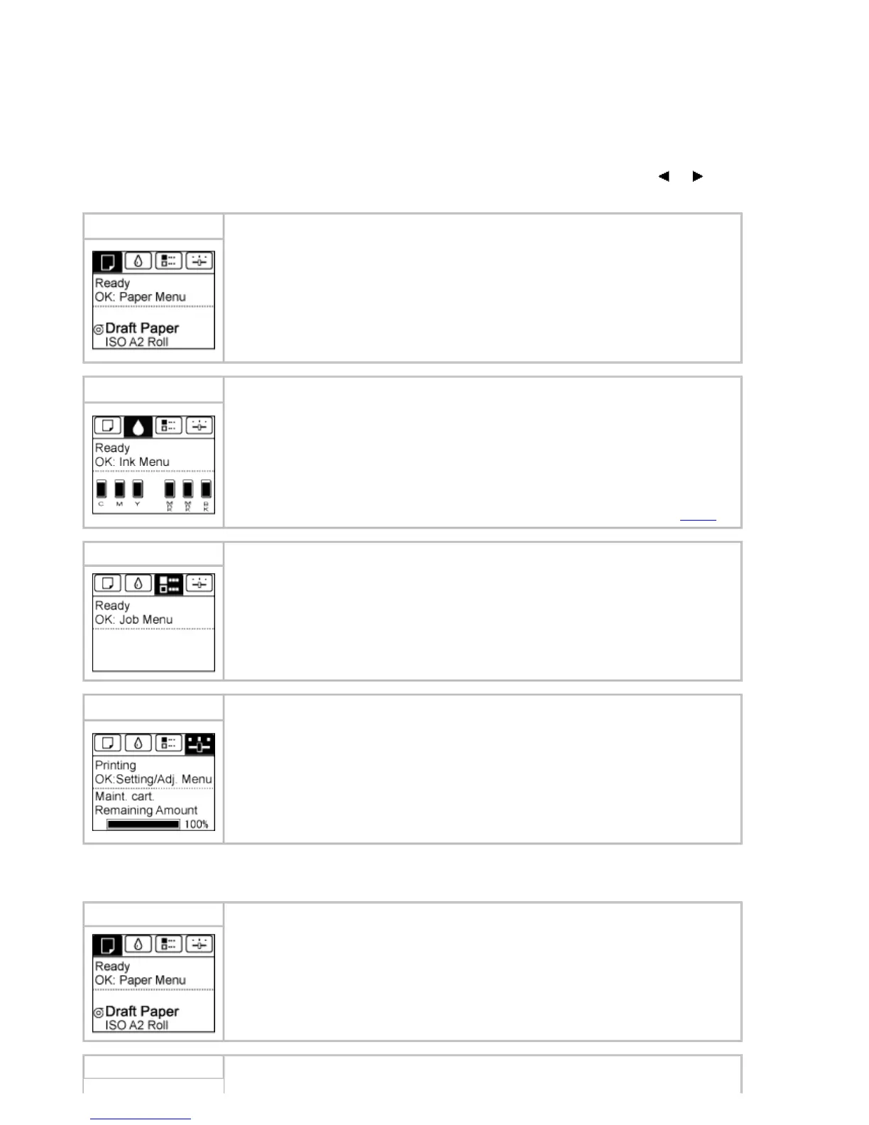 A tab indicating status and showing menus related to ink. Pressing the OK button when