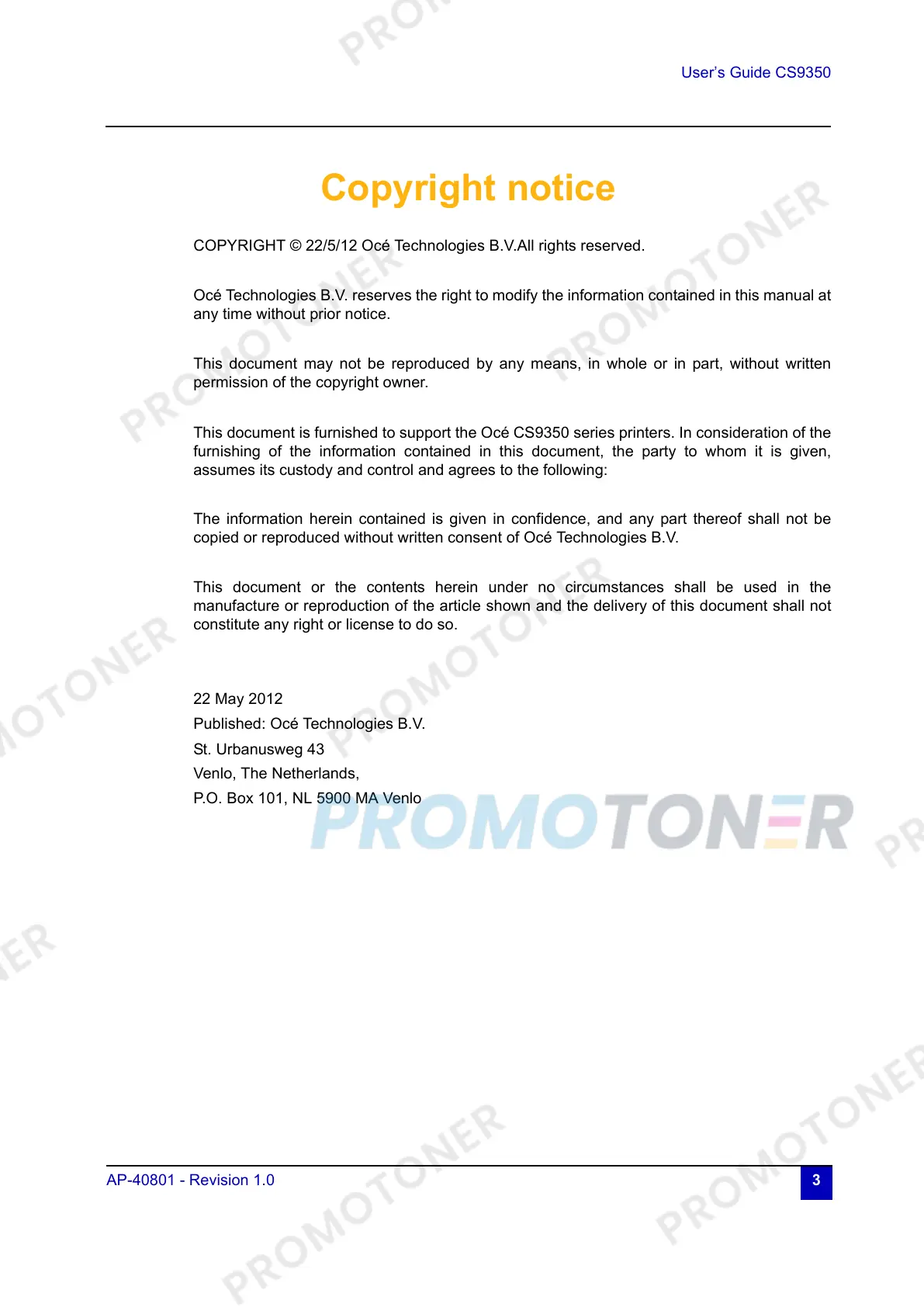This document is furnished to support the Océ CS9350 series printers. In consideration of the