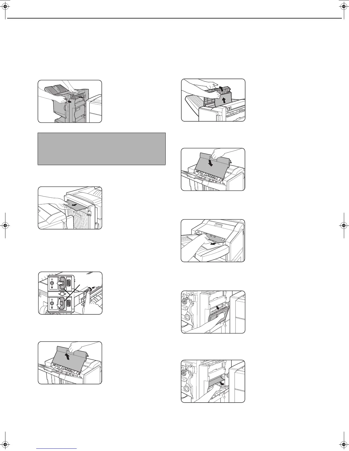 When a misfeed occurs in the saddle stitch finisher, remove the misfed paper following the procedure below.