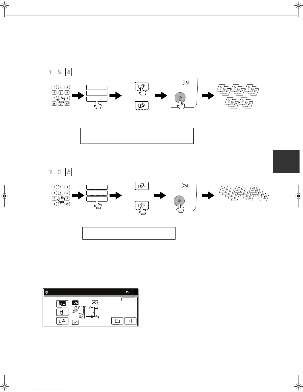 saddle stitch finisher. When the "CENTER TRAY" key is highlighted, output pages are delivered to the center
