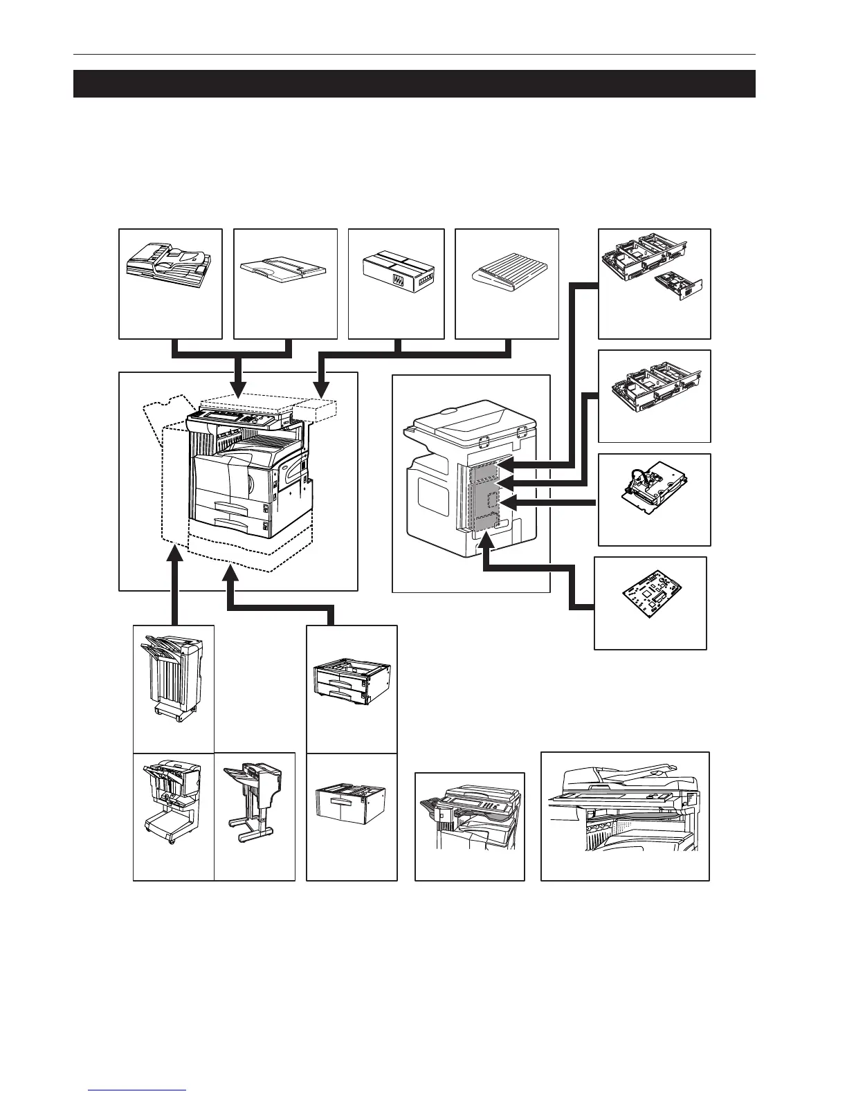 This section shows where to install the optional units for this copier. For more details, refer to the Operation Guide for the corresponding optional