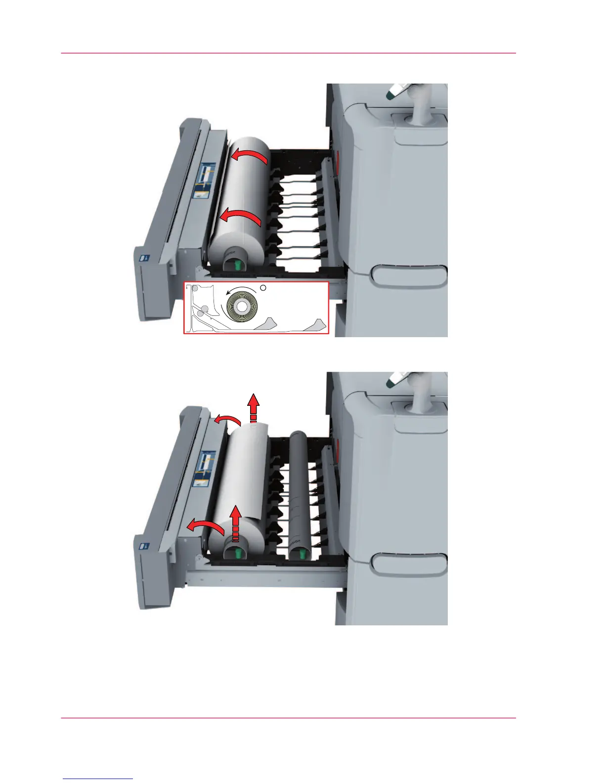 Use both hands (as indicated) to lift the roll holder with the media roll and put it on the