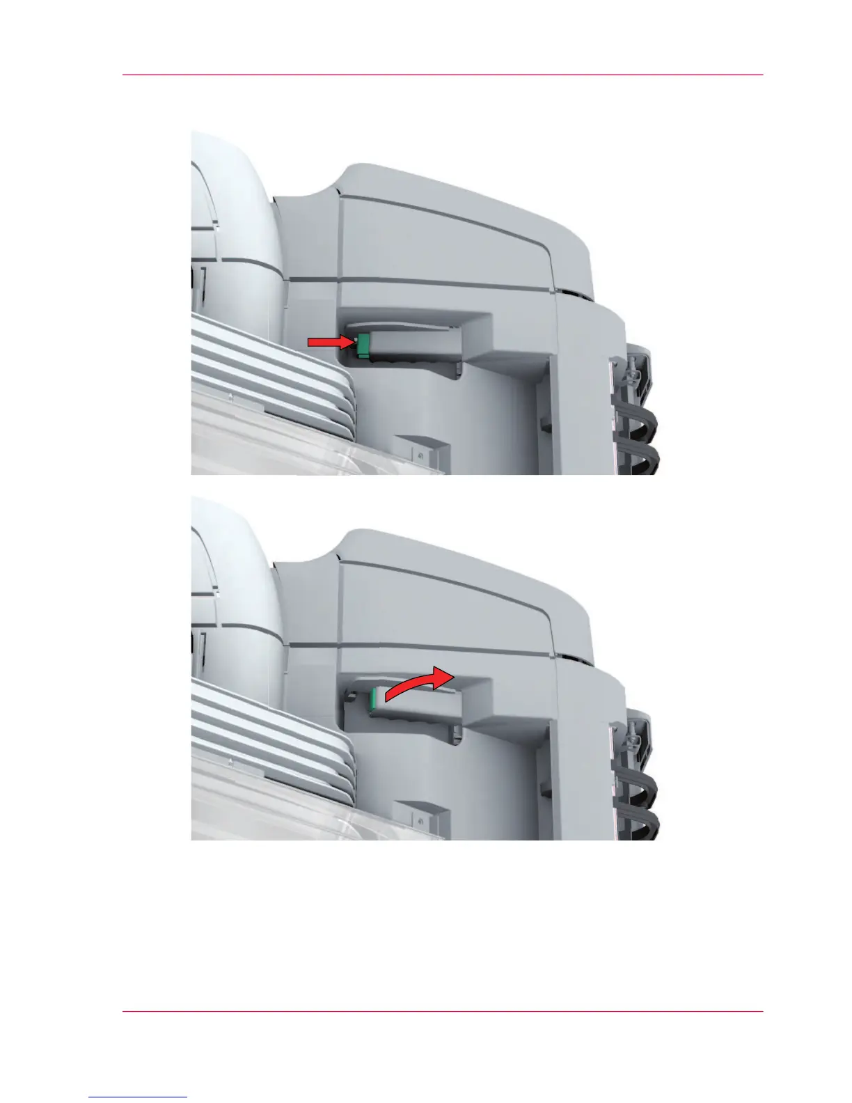Press the green knob on the media jam clearance handle to open the upper back cover.