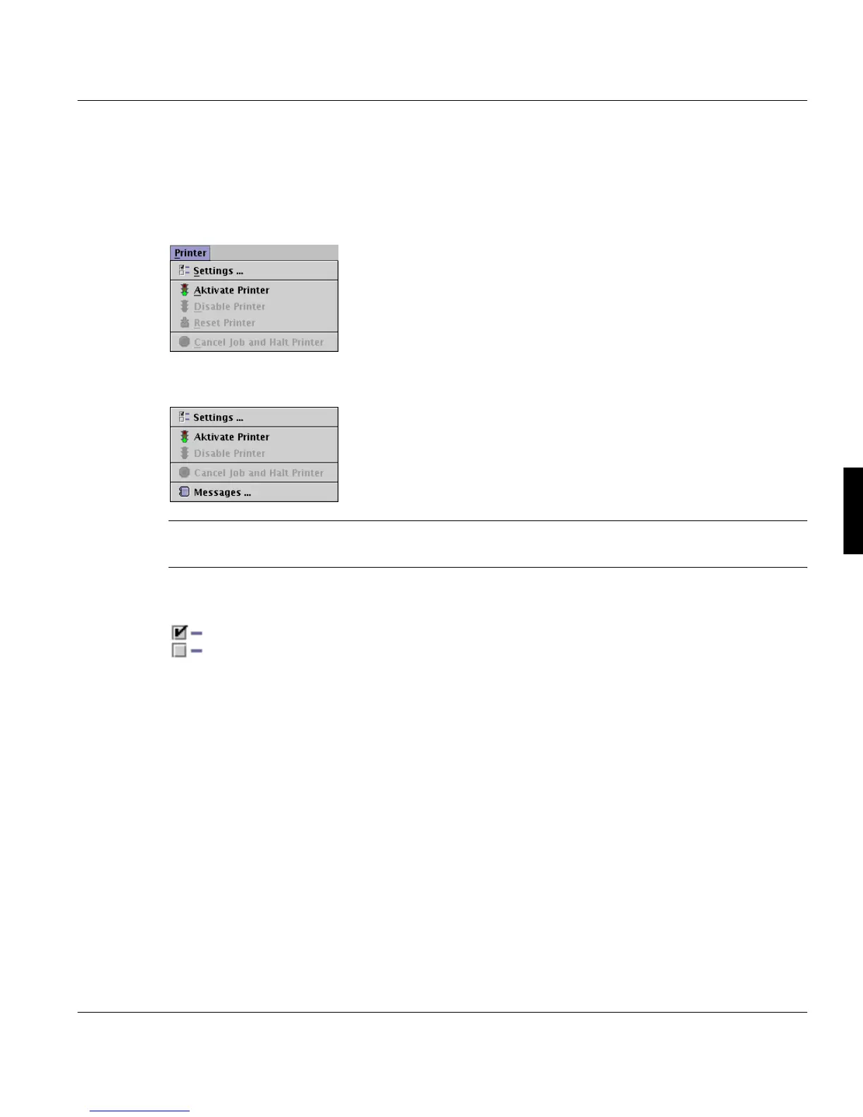 The 'Printer' menu is also accessible as a pop up menu by clicking a printer frame with the