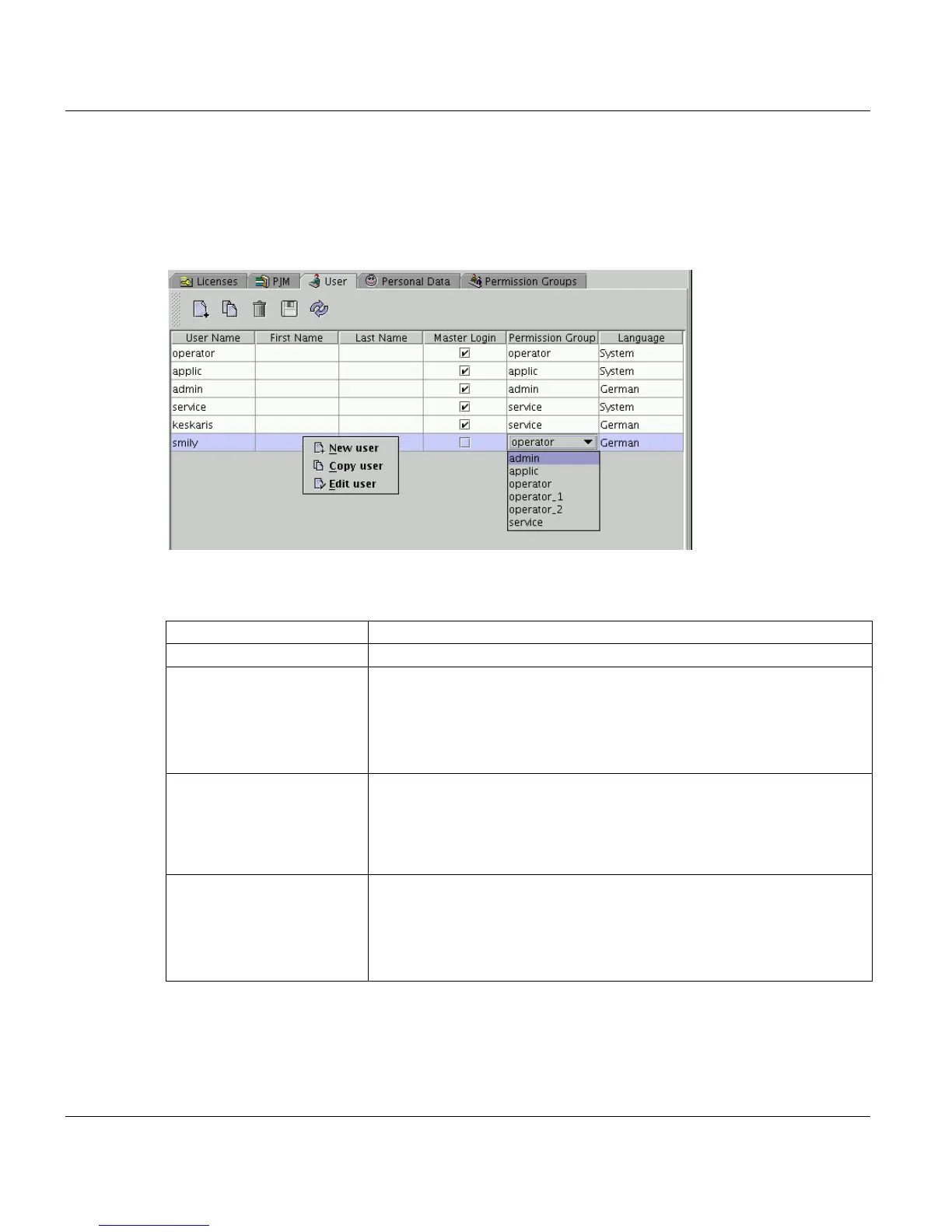 Use this application to create and administrate PRISMA users. The table lists the basic data