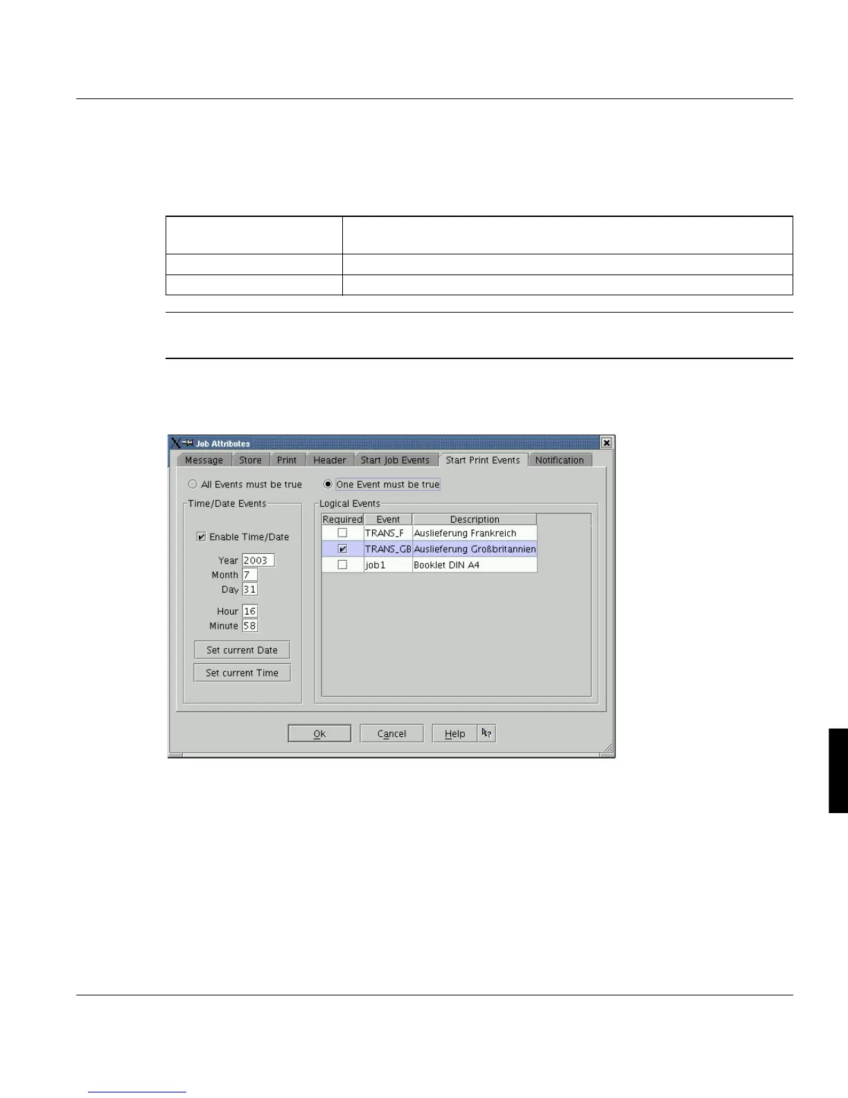A job is only printed (i.e. status ’Ready to print’), if the events selected here are true. Until