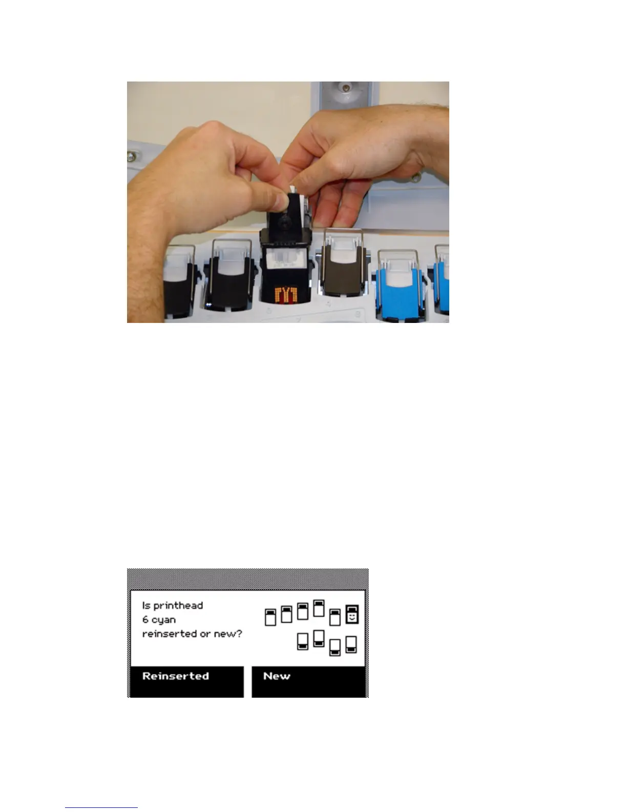 5 The screen displays the message 'Is printhead [number and color] reinserted or