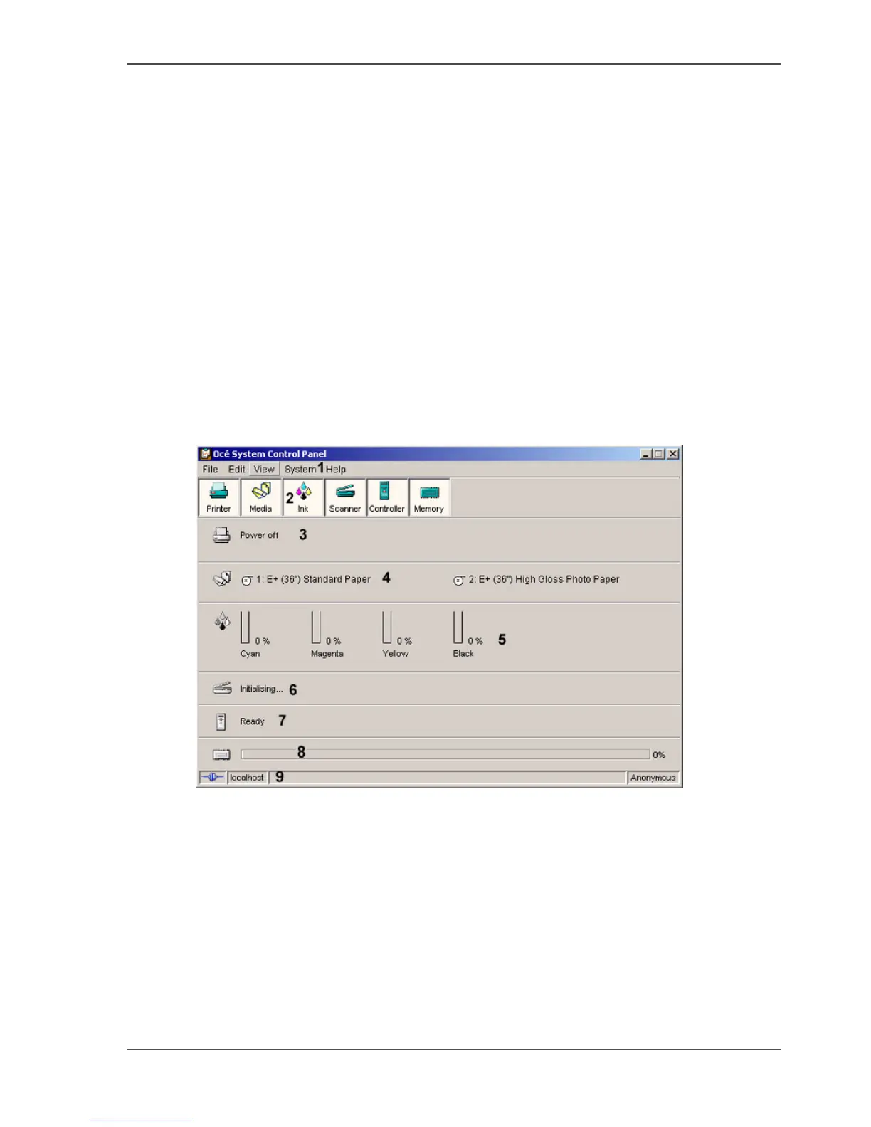 The Océ System Control Panel contains the following items.