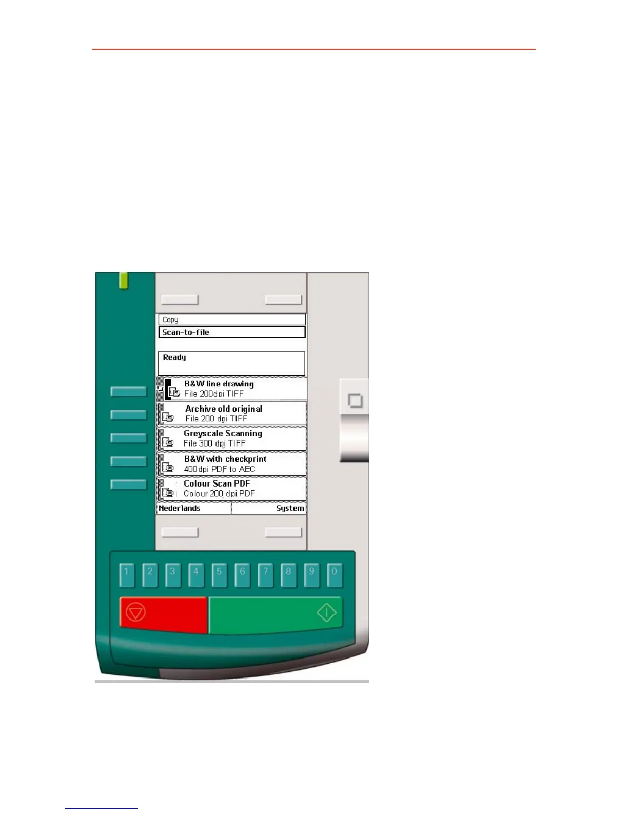 scanner operator panel shows five scan-to-file job templates. The scan-