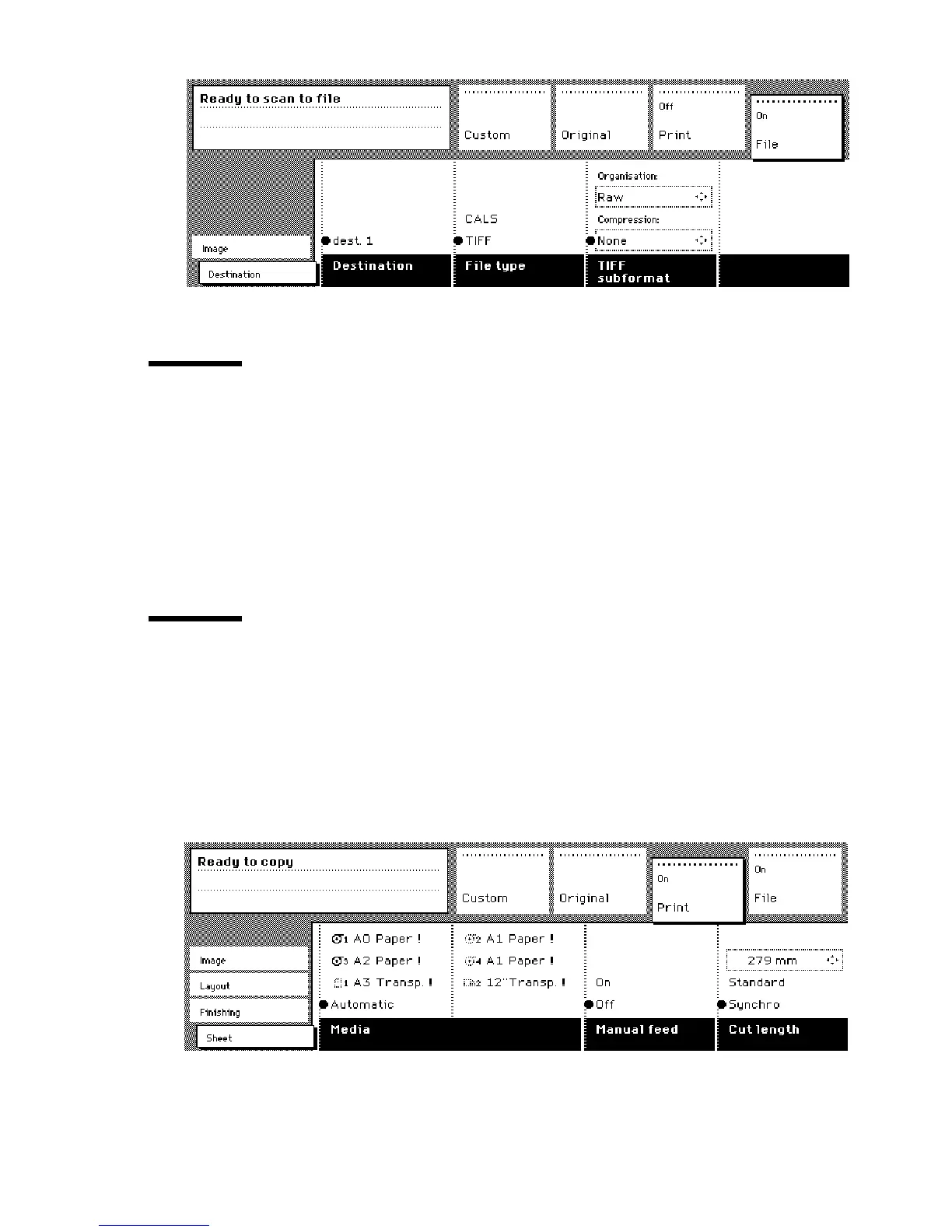 On start-up of the Océ TDS600 Copier, the ‘Custom’ card is displayed (see