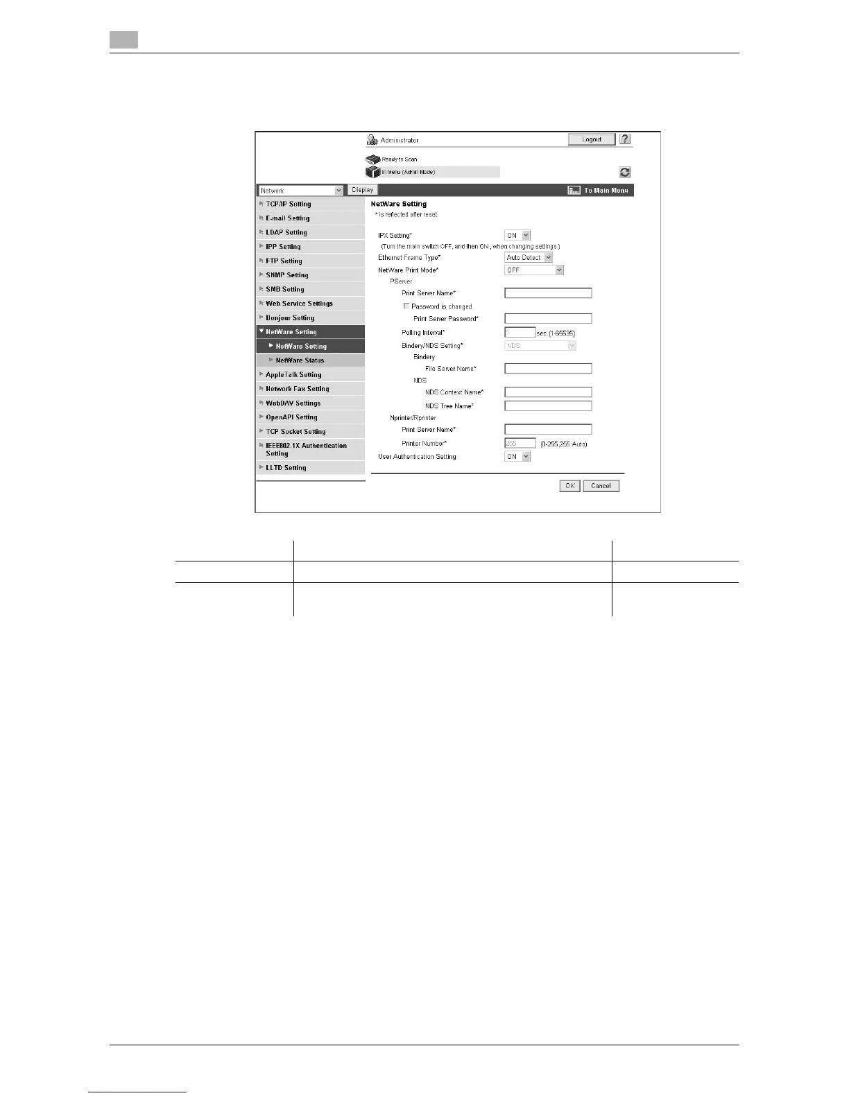 In the administrator mode of Web Connection, select "Network" ö "NetWare Setting" ö "NetWare Setting".