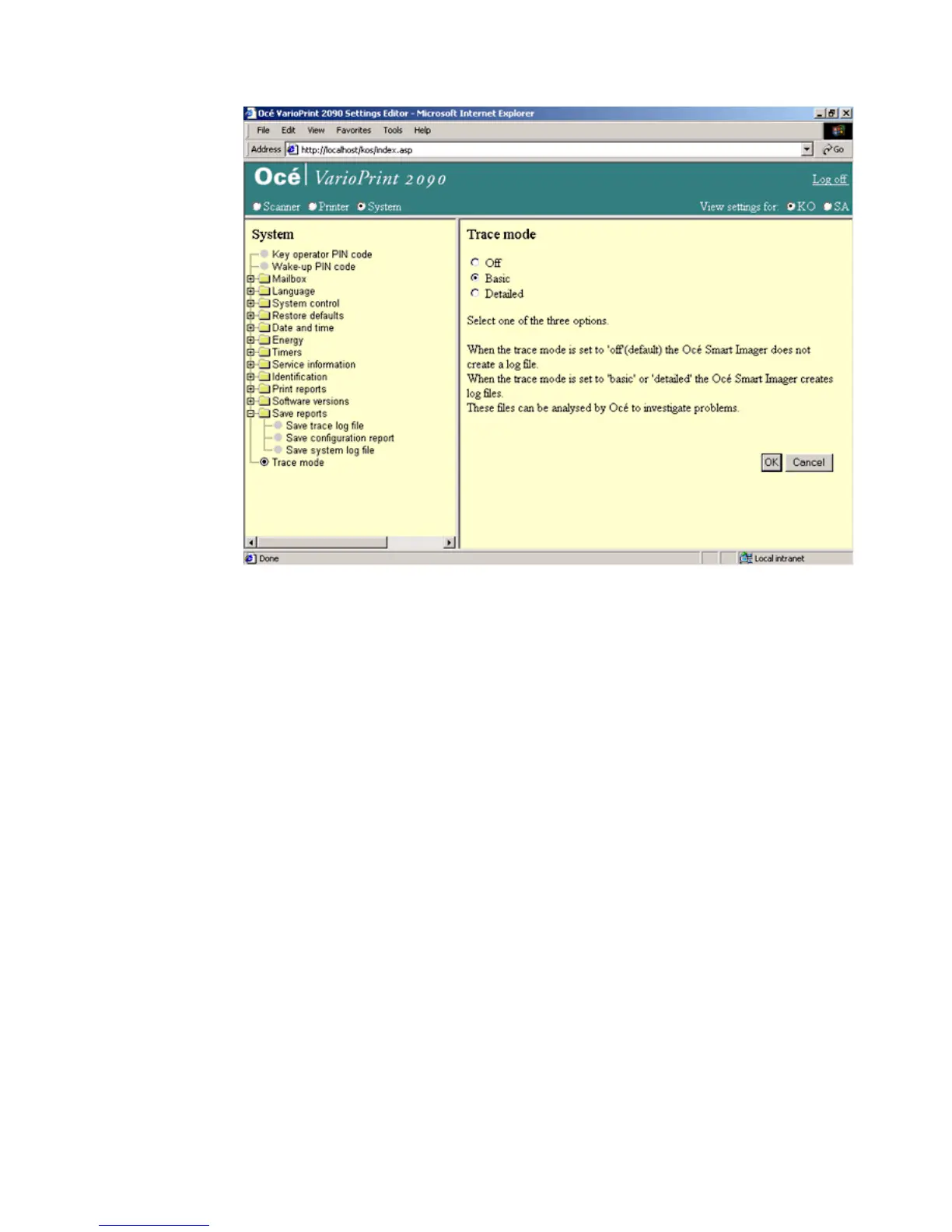 Select 'System' in the title bar of the Océ VarioPrint 2090 Settings Editor.
