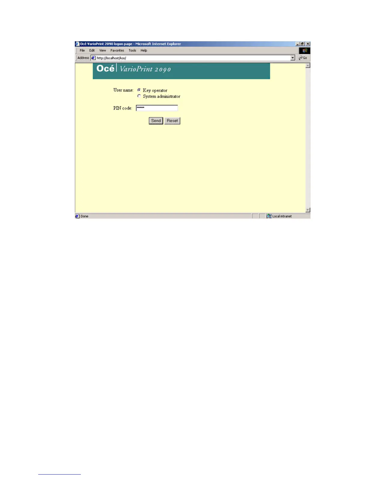You now see the logon page of the Océ VarioPrint 2090 Settings Editor. (see