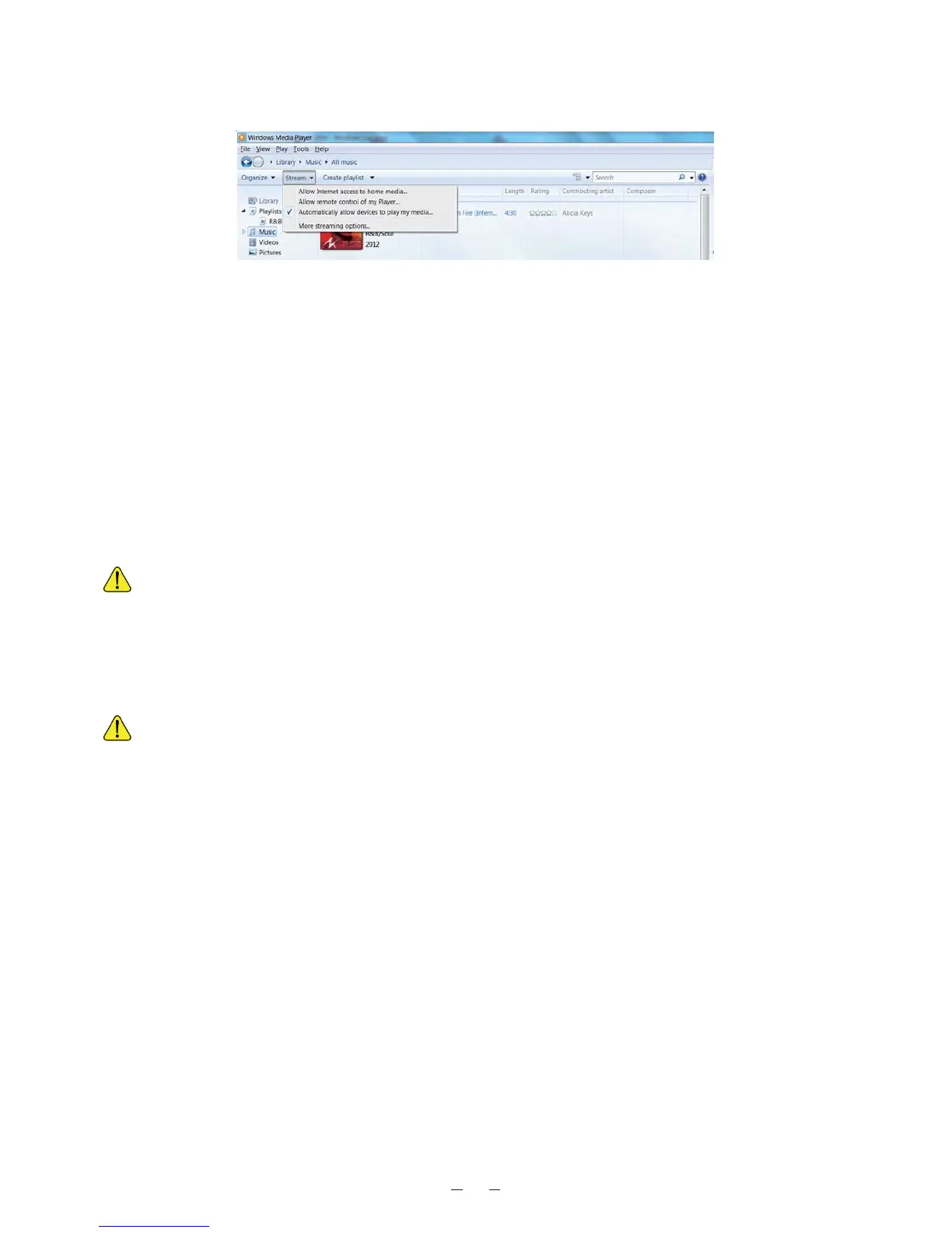 vi) Launch the Windows Media Player, select <Stream> and choose <Automatically allow