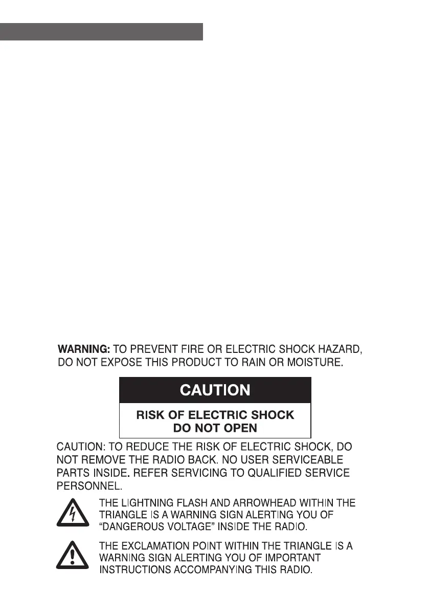 radio immediately if water or liquids is spilled into the radio. Consult with the shop