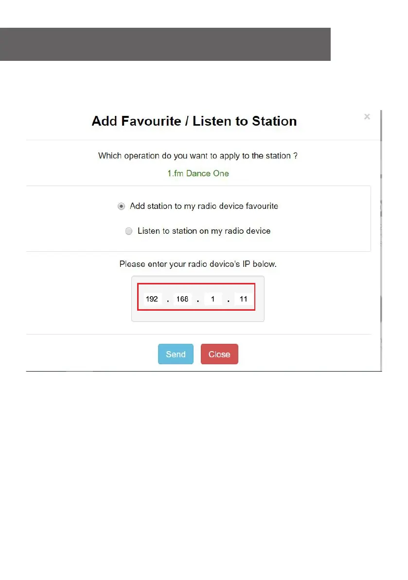 - It will prompt you whether to "Add Favourite" or "Listen to Station". Enter the IP
