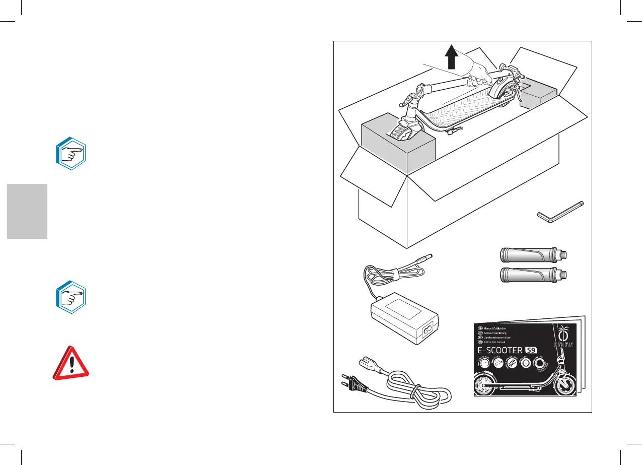 - Sobald die Verpackung geöffnet ist, den Roller und die anderen