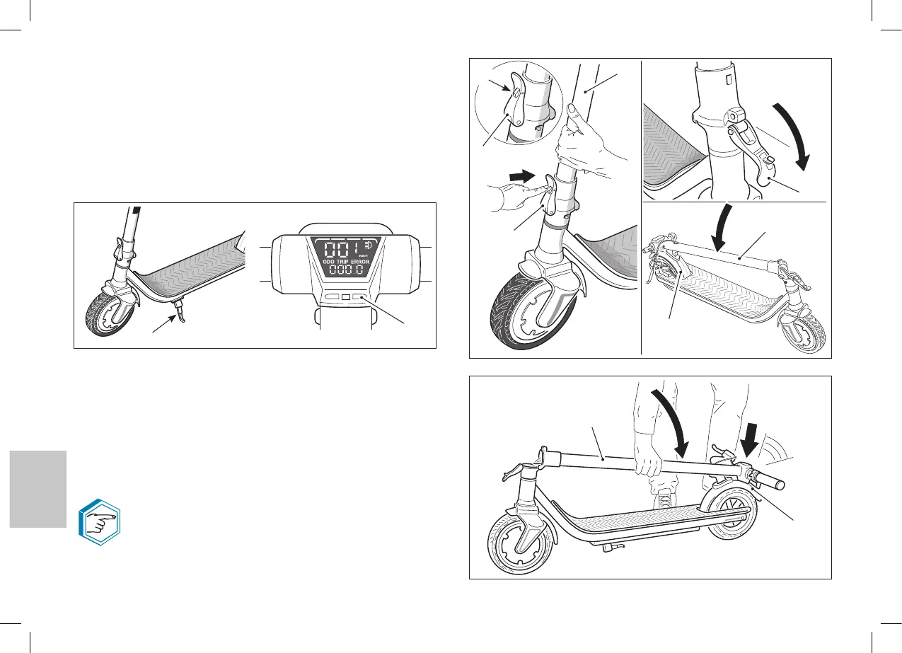 e• Fold the handlebars stem (7) on the rear mudguard (15), then