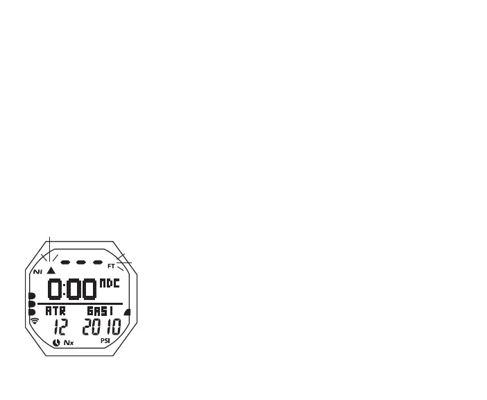 > Current Depth, 3 dashes ( - - - ) flashing, with FT (or M) icon