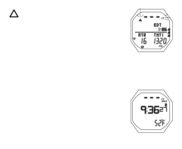 > Current Depth, 3 dashes ( - - - ) flashing, with FT (or M) icon