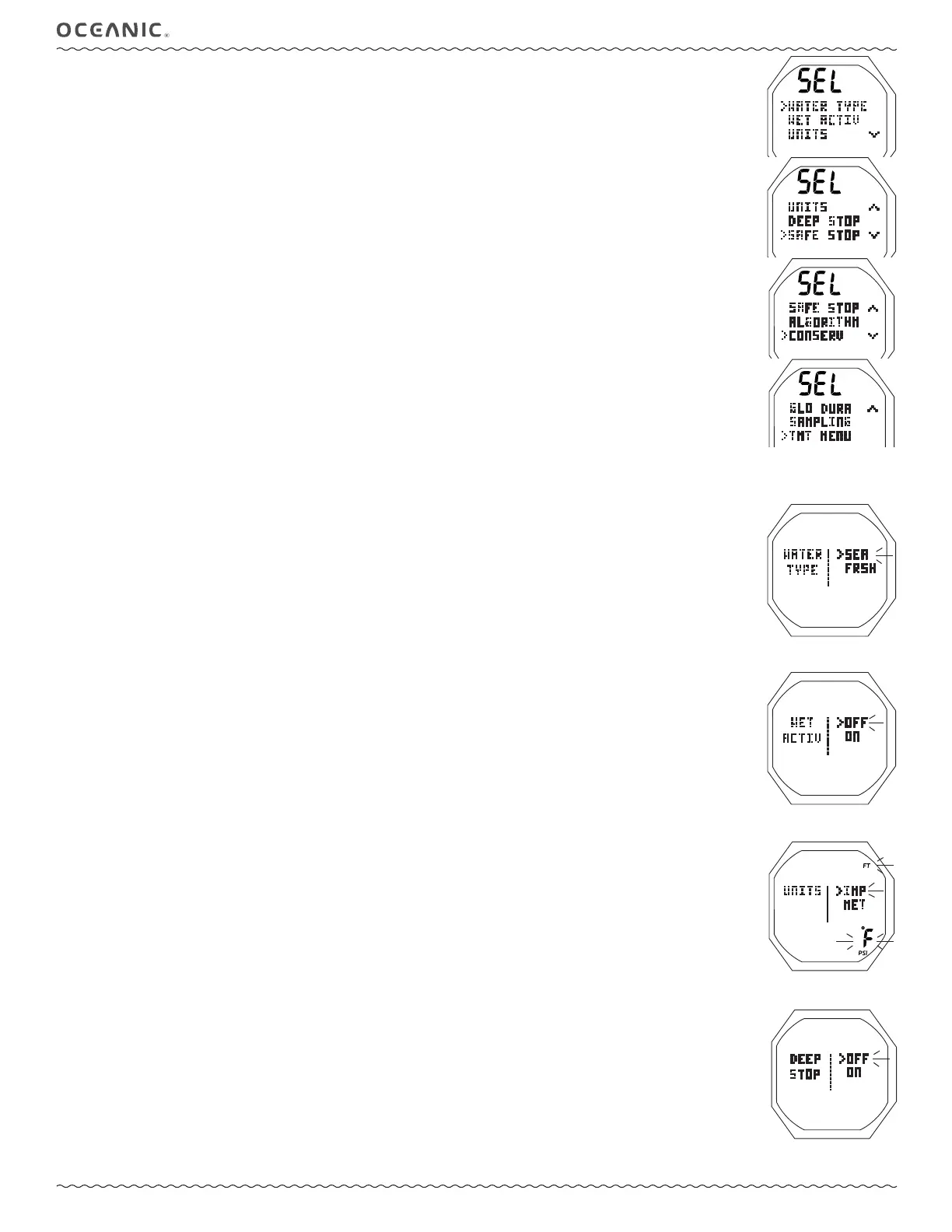 Menu selections include >> Water Type >> Wet Activation >> Units >> Deep Stop* >> Safety Stop* >> Algorithm* >>