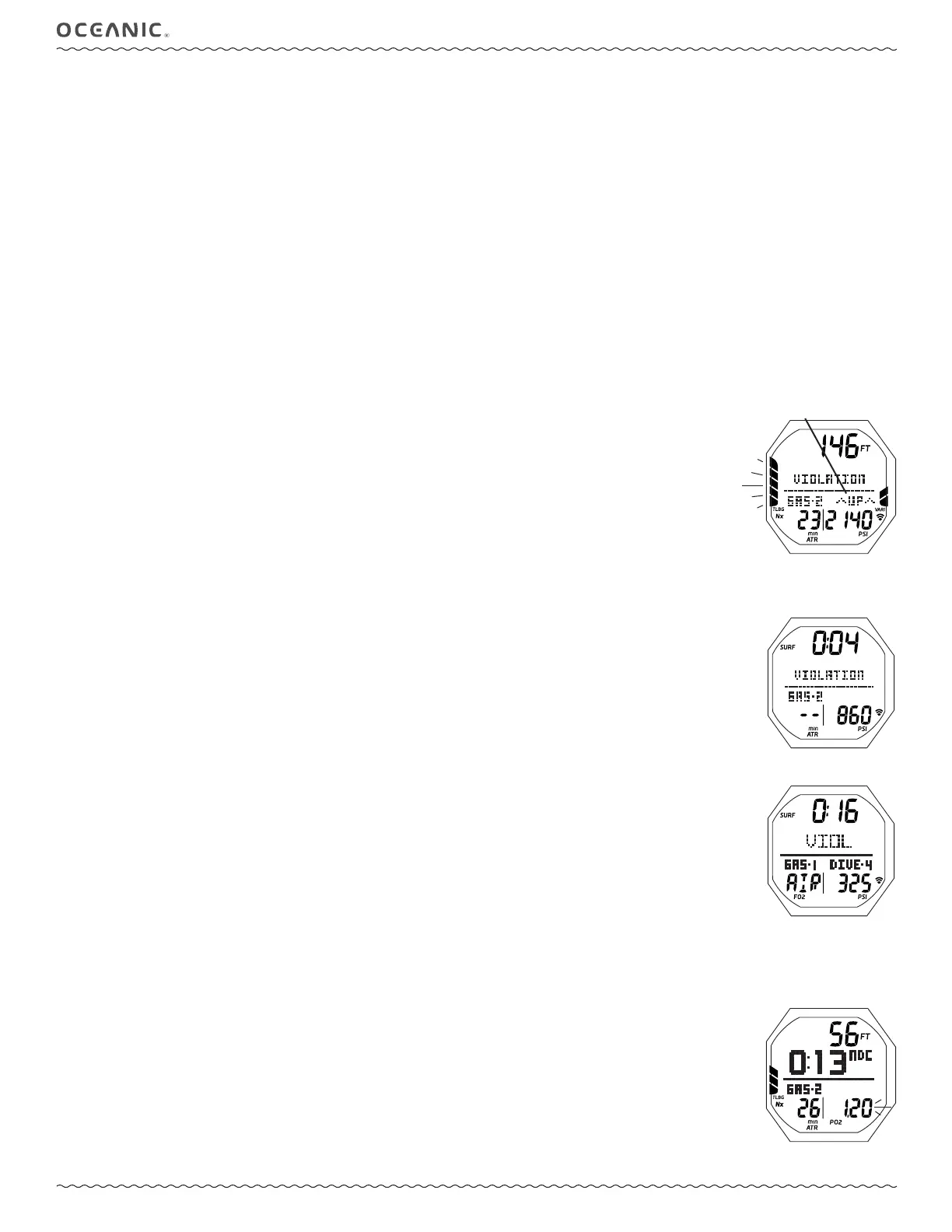 Upon activation, the graphic VIOLATION is displayed in place of Deco Stop information, the Audible will sound, and the LED will