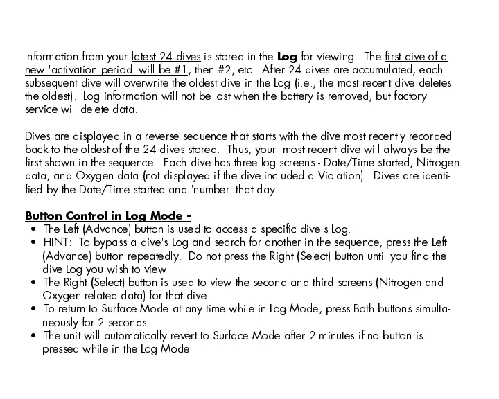 subsequent dive will overwrite the oldest dive in the Log (i.e., the most recent dive deletes