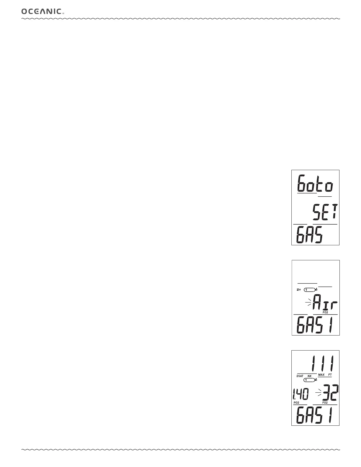 • S (< 2 sec) to save the FO2 setting and flash the PO2 digits if Nitrox, or access Set Gas 2 if Air.