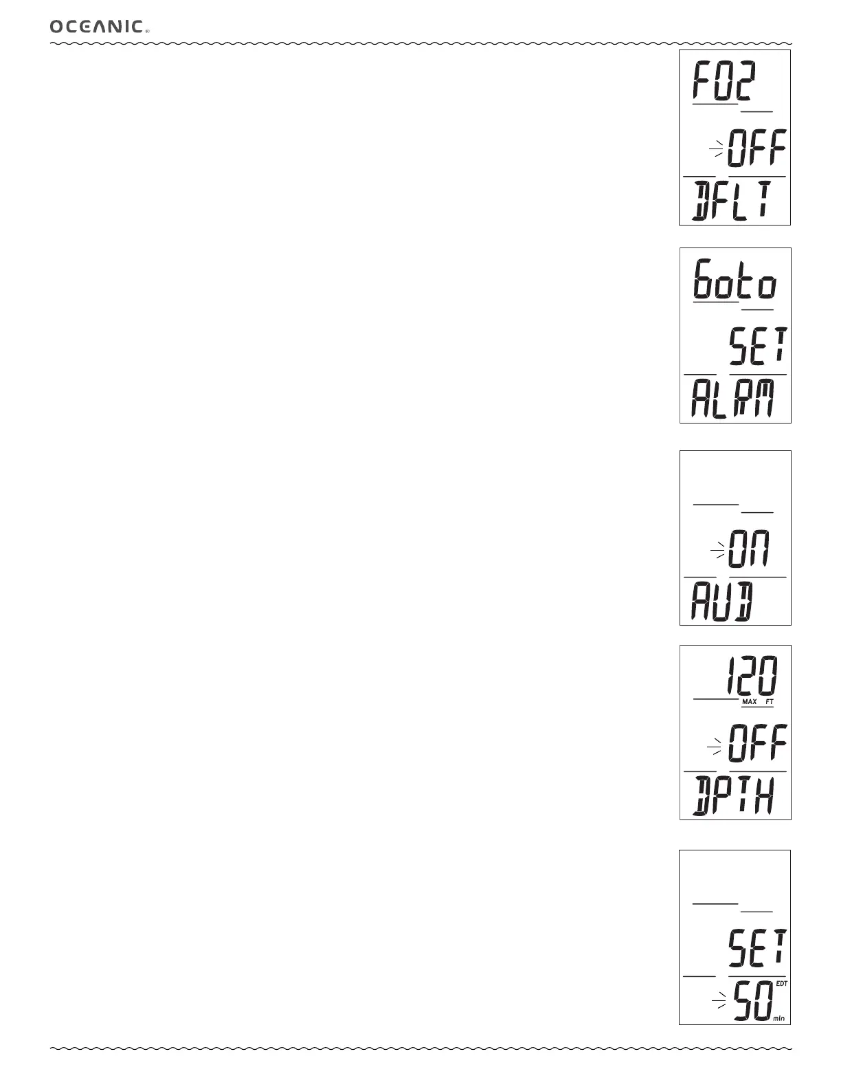 • S (< 2 sec) to save the selection and flash the Depth digits, if Set is saved; or access Set EDT Alarm, if OFF or ON is saved.