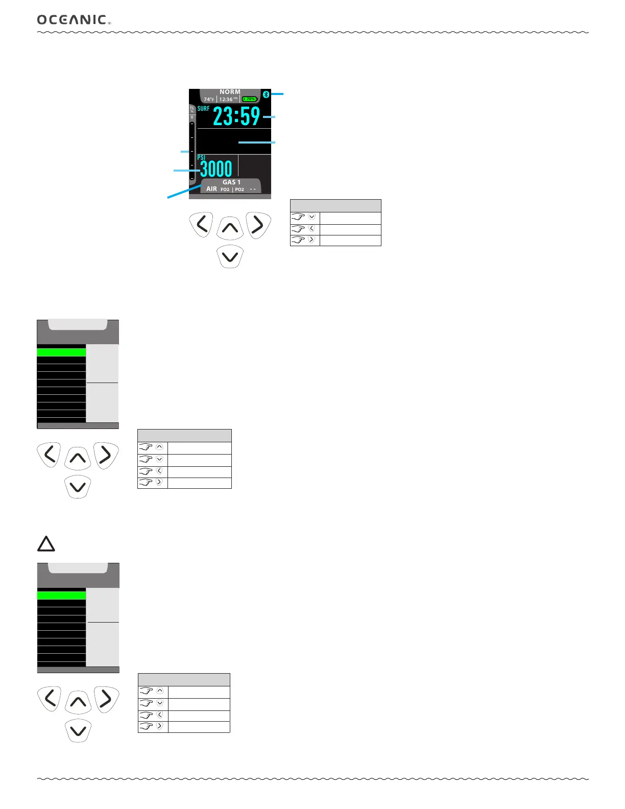 To view dive data, plan dives, or change settings you must navigate through the Norm Main Menu. Some screens simply display data. While other